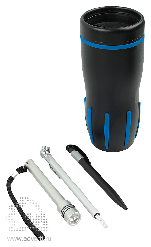 В наборе: кружка с термоизоляцией на 450 мл, приспособление для измерения давления в шинах, фонарик, ручка, блокнот. Одним словом, этот комплект содержит все самое необходимое для того, чтобы в случае надобности выяснить, не спущено ли у вас колесо и выпить чашечку горячего чая.
