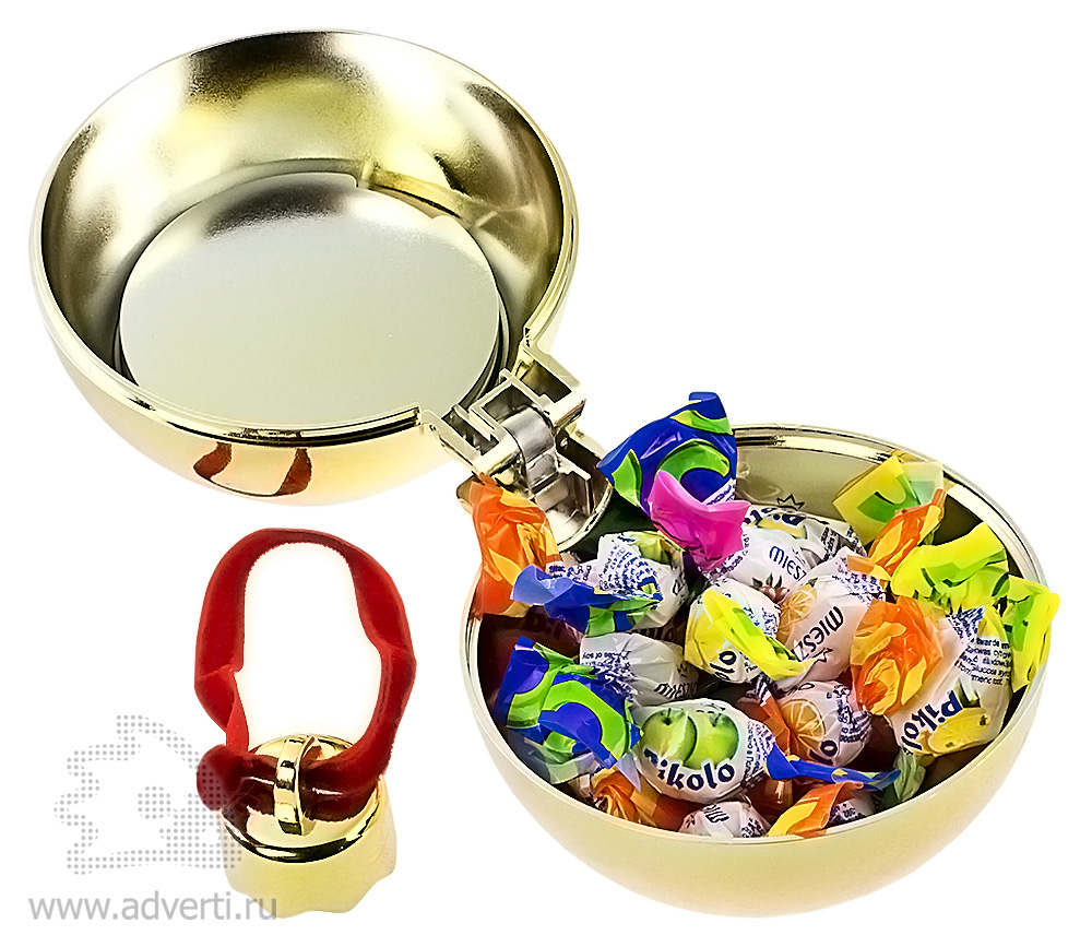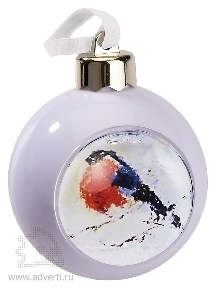 В такой шар-шкатулку можно положить все, что угодно. Конфетки или же маленький подарок, что-то вроде фигурки или же приятных офисных мелочей. А еще ее можно подвесить на елку. Стикер с снегирем заменяется на изображение вашего логотипа по желанию.