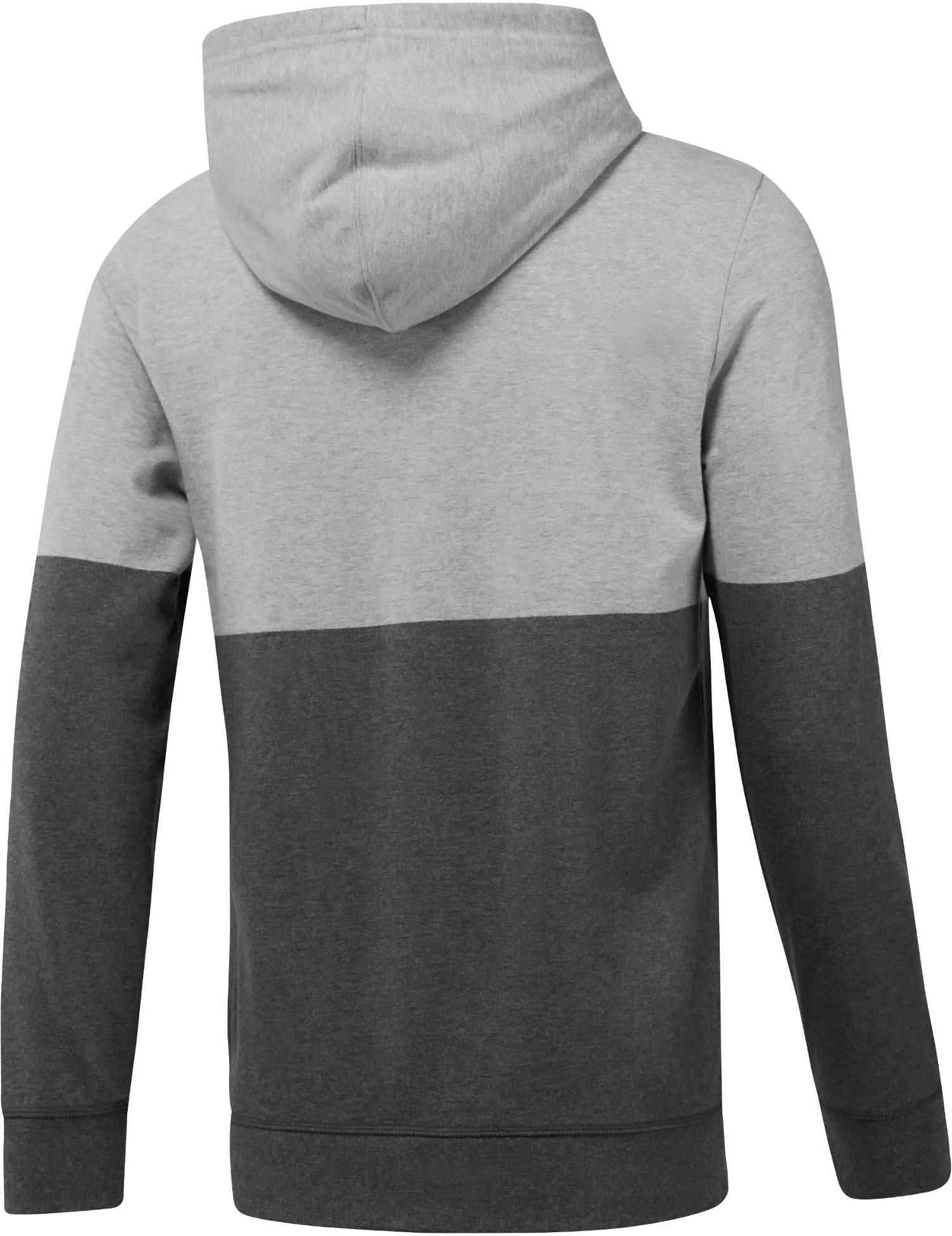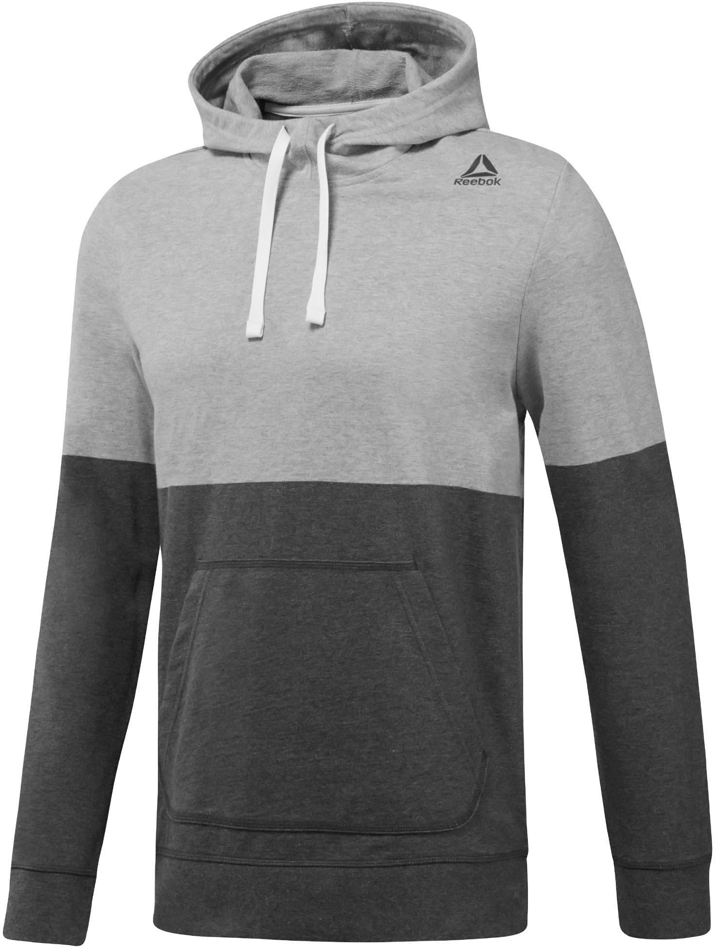 Двухцветная толстовка серого цвета имеет облегающий крой и карман-кенгуру. Произведена Reebok, одним из самых известных брендов спортивной одежды.