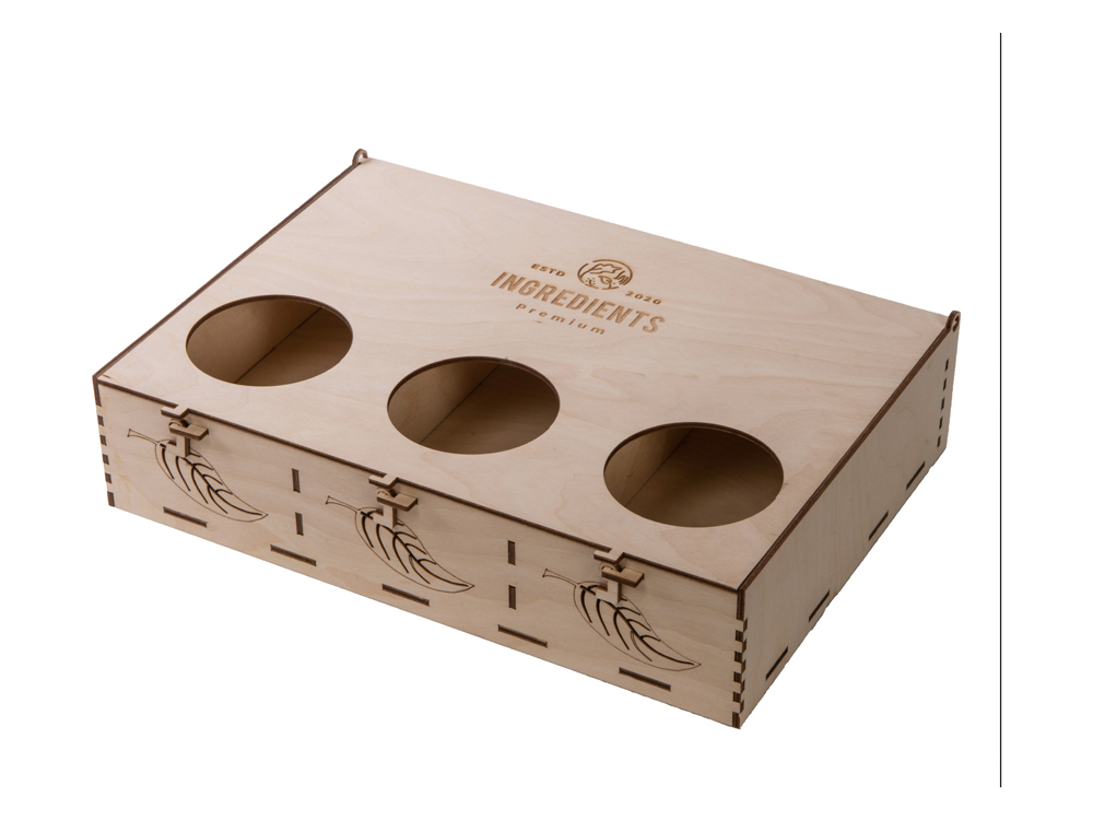 Коробка состоит из трёх секций. Крышка коробки фиксируется тремя деревянными замочками, снабжена тремя отверстиями для ознакомления с содержимым. Отлично подойдет для чая, кофе и других подарков.