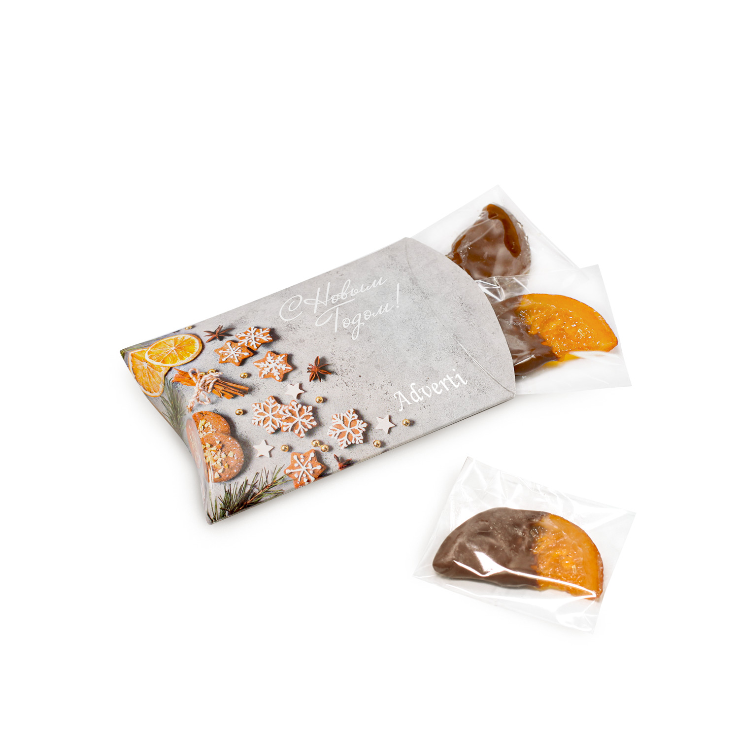 Апельсиновые дольки в шоколаде, коробка с готовым дизайном купить сувенирную продукцию с логотипом на сайте adverti.ru