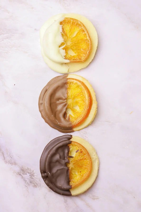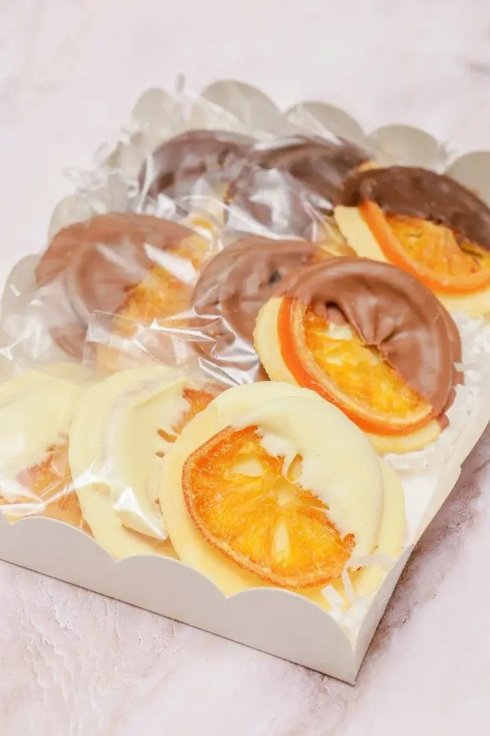 Апельсиновые цукаты на печенье в глазури — это десерт из засахаренных апельсиновых медиантов, покрытых шоколадной глазурью. Отличный перекус на работе, в дороге, школе, и просто комплимент. Сладко-кислый вкус апельсина прекрасно дополняет насыщенность шоколада, создавая многогранный вкус и приятную текстуру — мягкую мякоть апельсина под хрустящим слоем глазури. Это удобное лакомство к чаю или кофе. Цветовое сочетание яркого цуката, как нельзя лучше оттеняет шоколад в любом варианте белый, молочный или темный, а при добавлении брендинга в виде наклеек или коробки, такой десерт становится приятным подарком в виде корпоративной лояльности.
