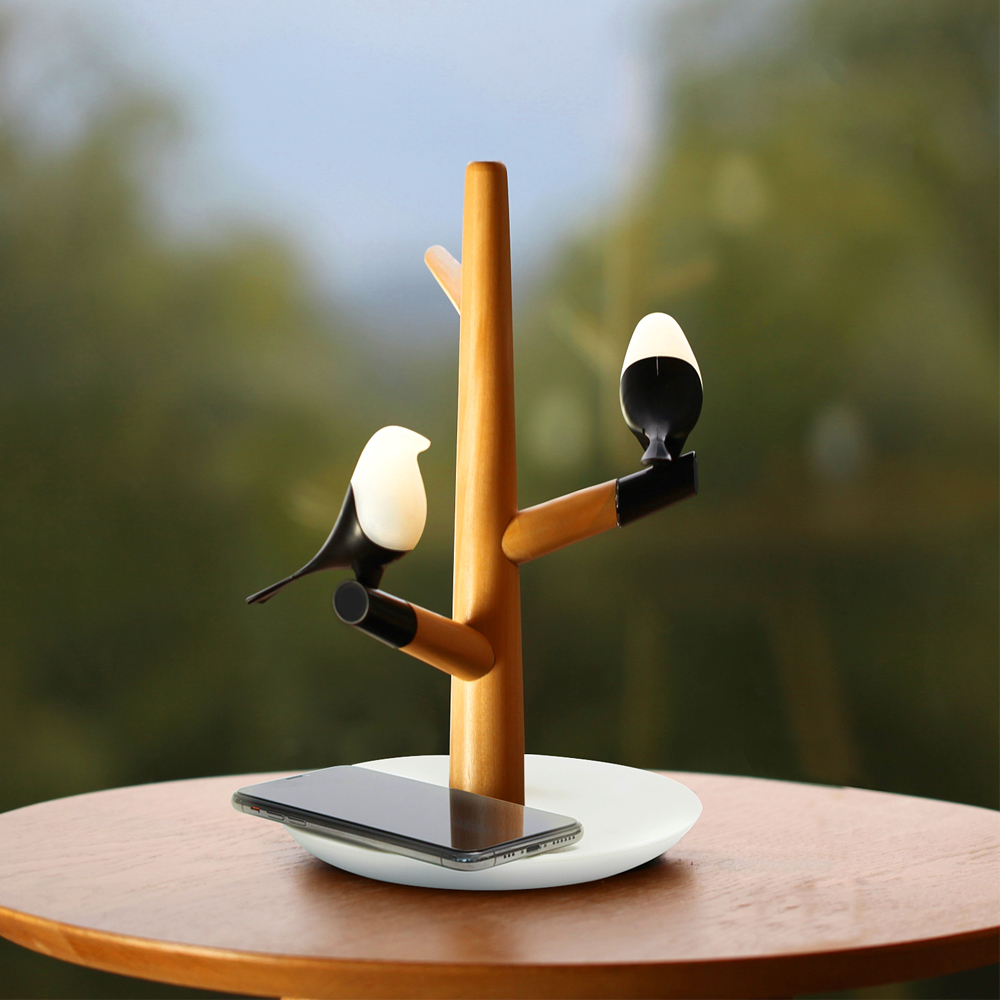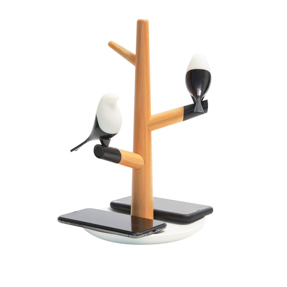 Мягкий свет дополняет функциональность устройства, которое позволяет заряжать два мобильных устройства при помощи технологии Qi.