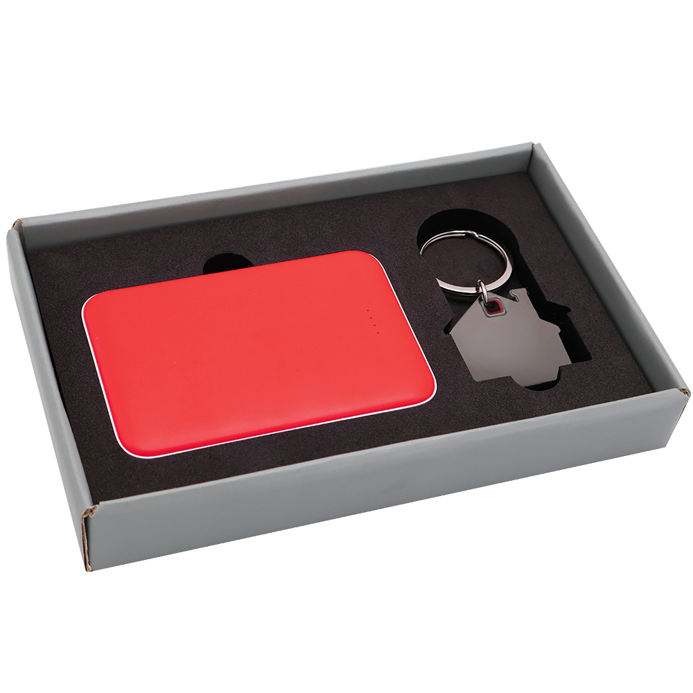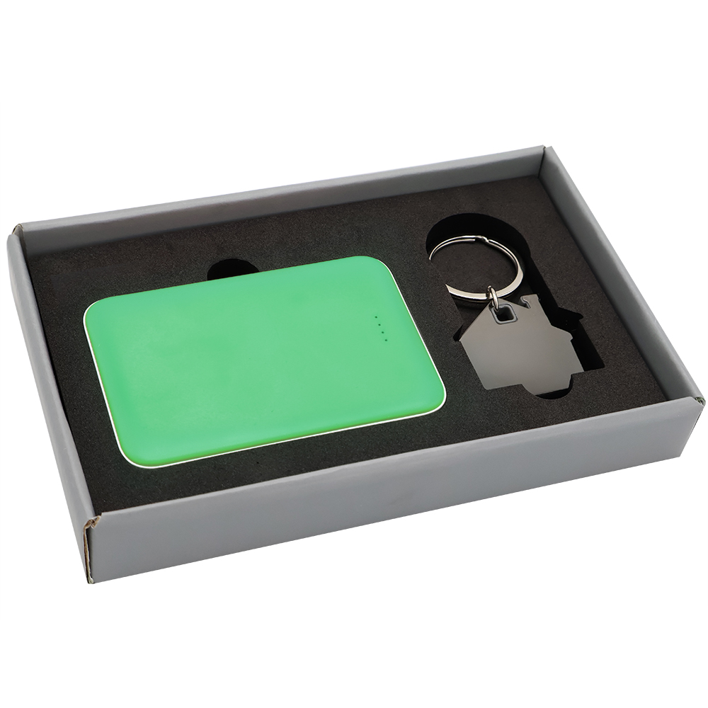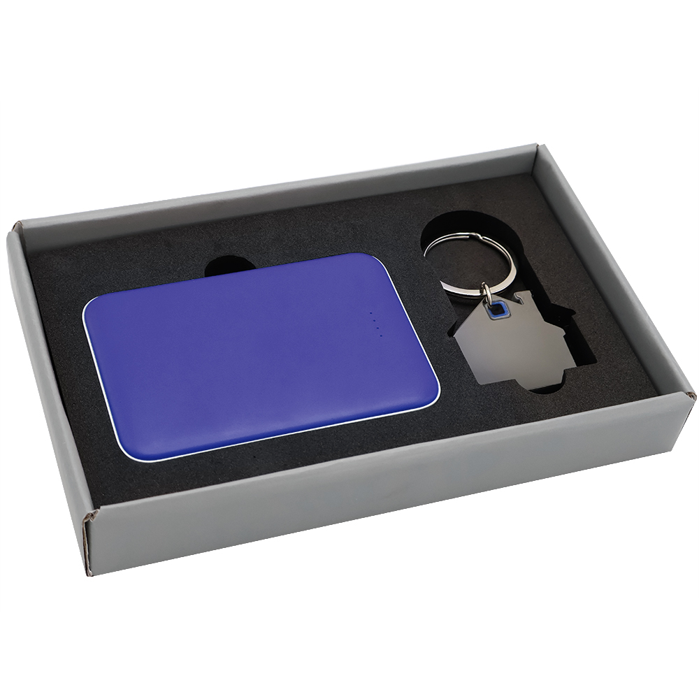Подарочный набор в элегантной цветной картонной коробке серого цвета с конструкцией крышка-дно. Внутри расположены аккуратно закрепленные на ложементе внешний аккумулятор емкостью 5000 mAh и металлический карманный брелок. Внешний аккумулятор обладает компактным дизайном и обеспечивает надежный запас энергии для мобильных устройств в пути, а стильный металлический брелок станет практичным и эстетичным аксессуаром для ключей. Этот набор идеально подходит в качестве презента для тех, кто ценит удобство, качество и современный стиль.