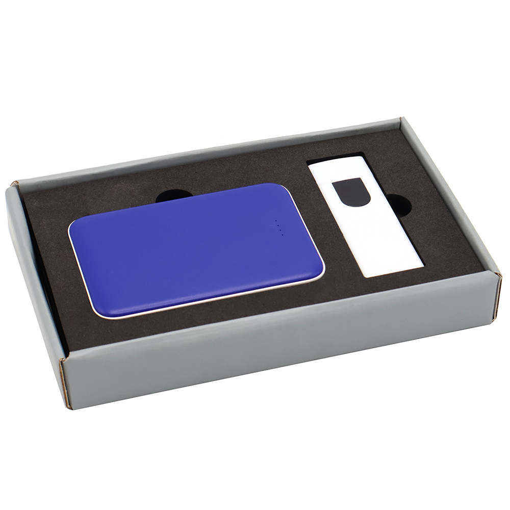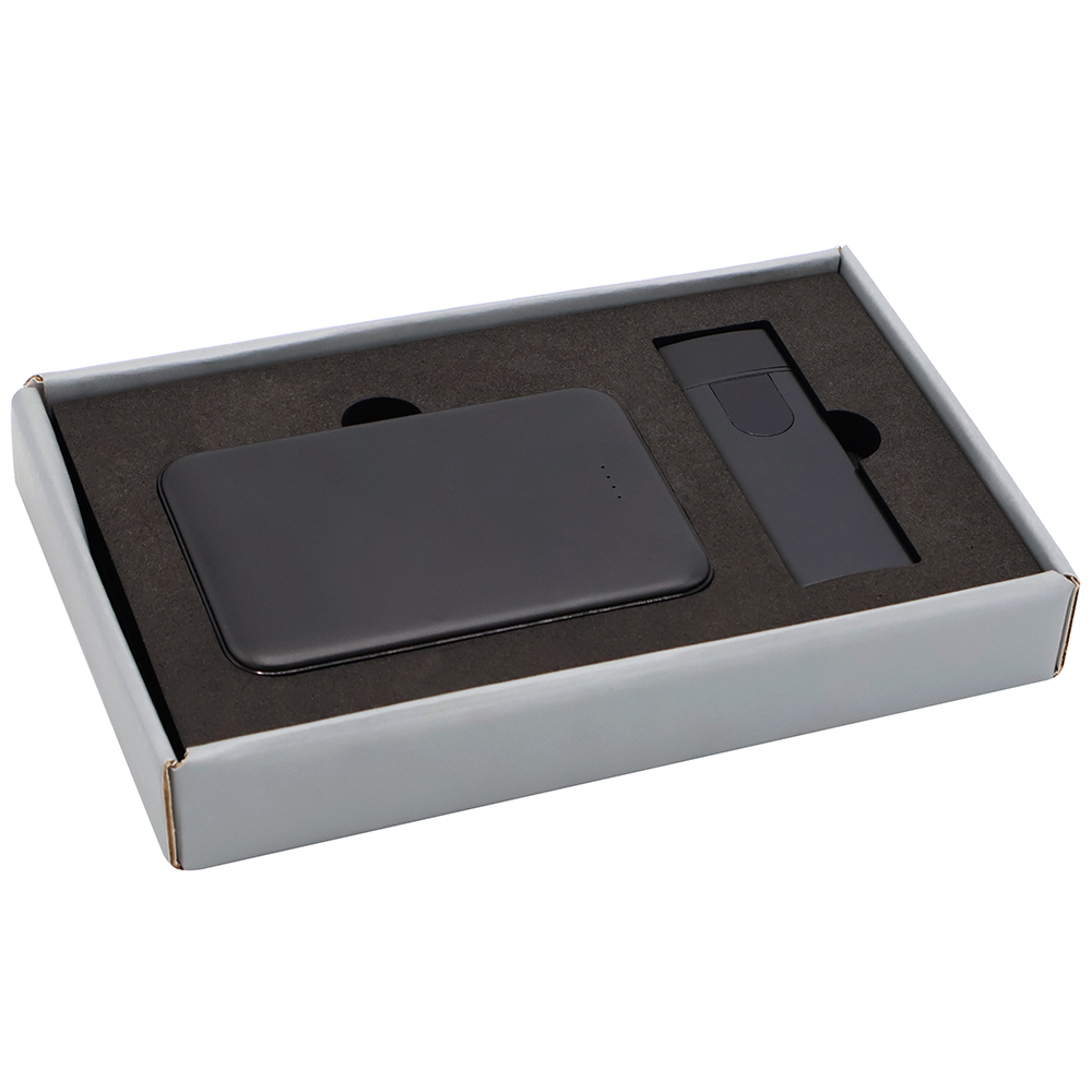 Подарочный набор в стильной цветной картонной коробке серого цвета. Внутри на аккуратном ложементе расположены внешний аккумулятор емкостью 5000 mAh и электронная зажигалка.