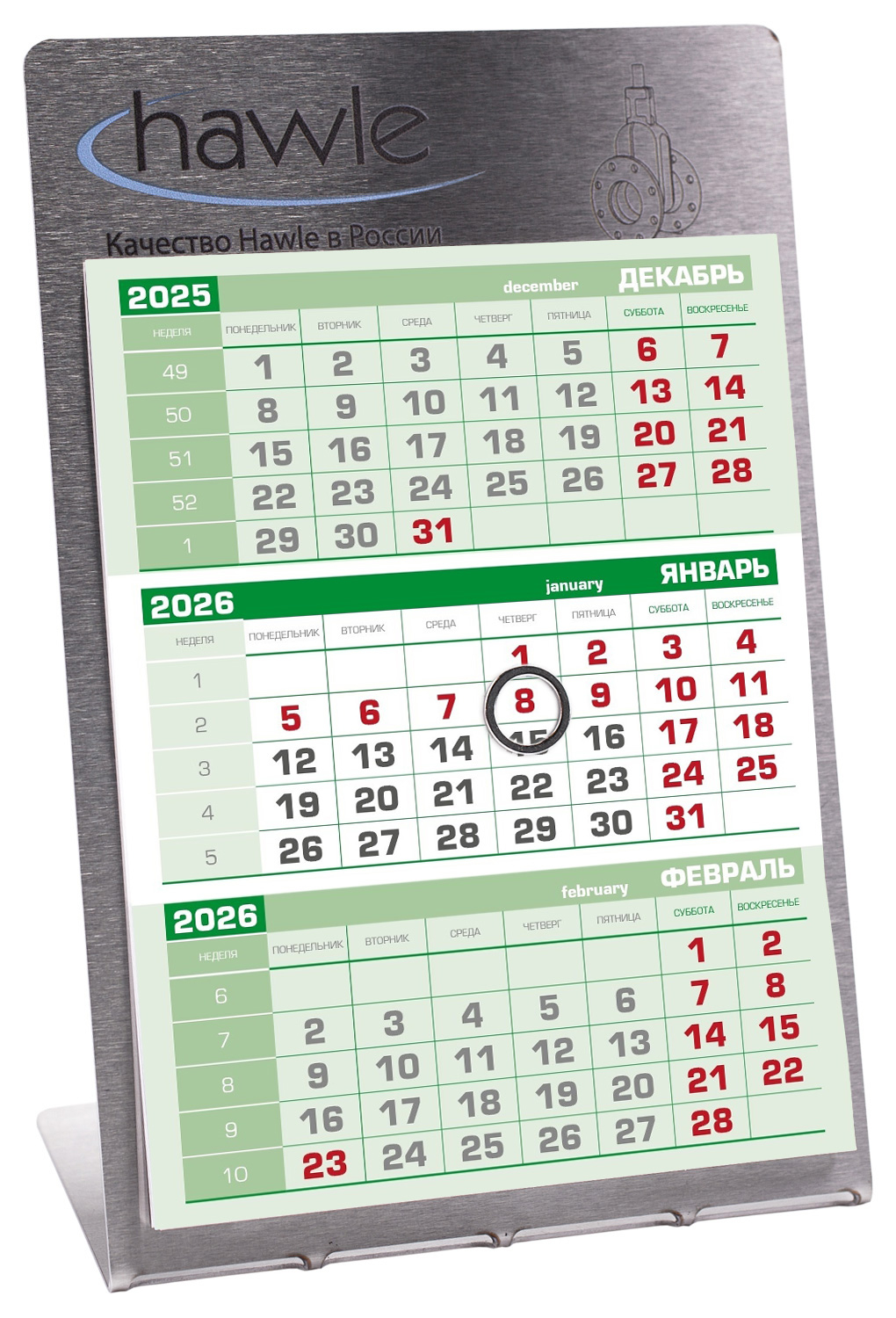 Металлический настольный календарь, на котором можно напечатать ваш логотип. В цену включено: календарь с УФ-печатью в одном месте изделия, стандартный календарный блок, конверт без печати белый, магнитное кольцо-курсор.