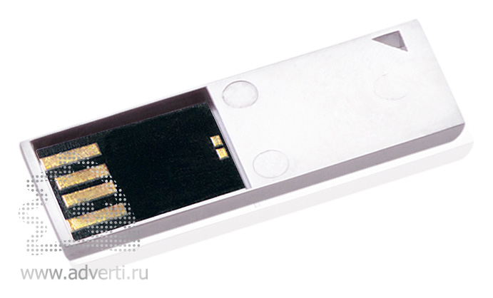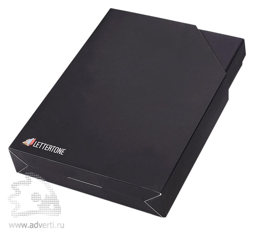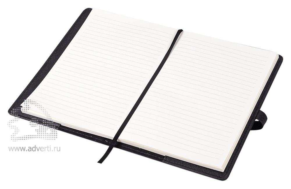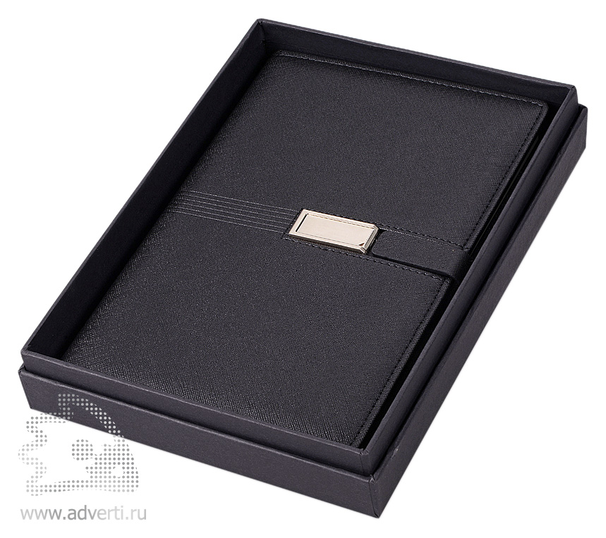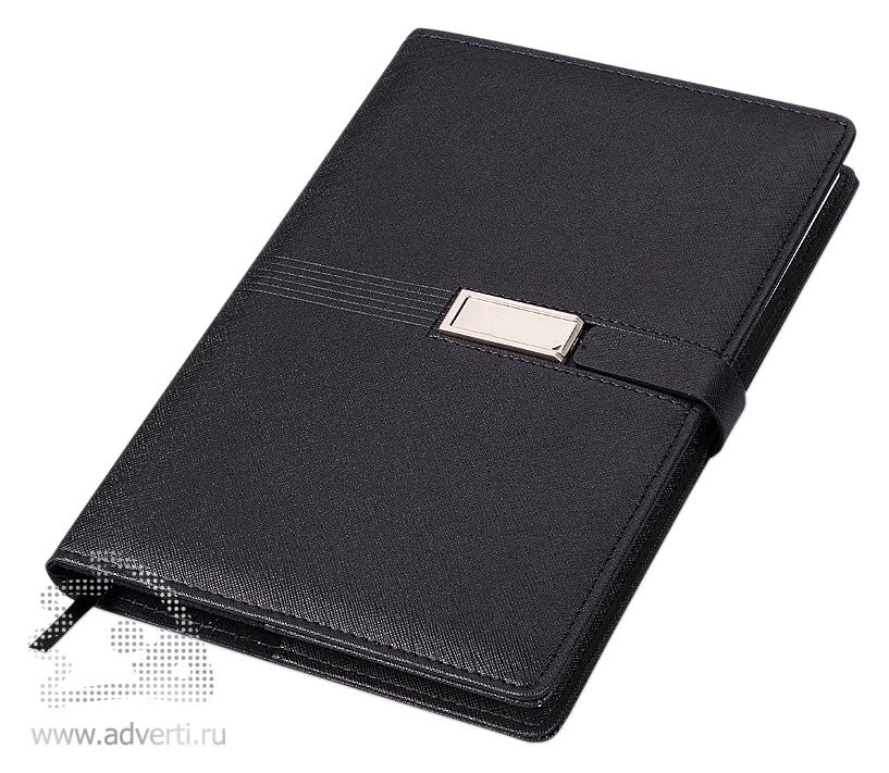 В прямоугольный шильд из нержавеющей стали вставляется флеш-карта, Флешка, которая одновременно является еще и застежкой, украшает этот замечательный блокнот, которому и без того есть чем похвастаться: черная кожаная обложка, ляссе и белая качественная бумага придутся по душе любому.
