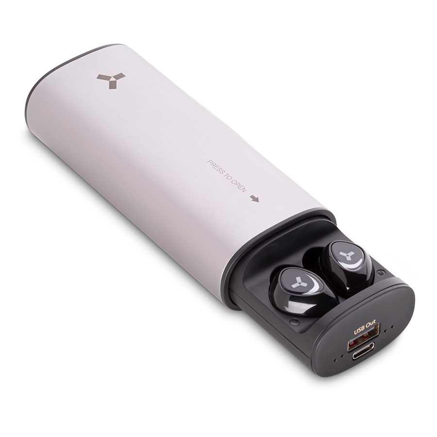 TWS-наушники два в одном — зарядный кейс можно использовать не только для наушников, но еще и как power bank ёмкостью 5000 мАч.