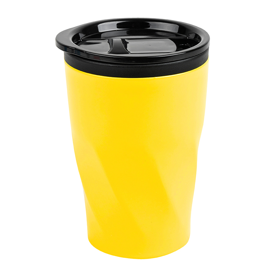 Яркая кружка с рельефной нижней частью «волнами». Выполнена из пластика внутри и стали снаружи, поэтому сохраняет температуру она не очень долго — зато прекрасно подходит для использования в офисе!
