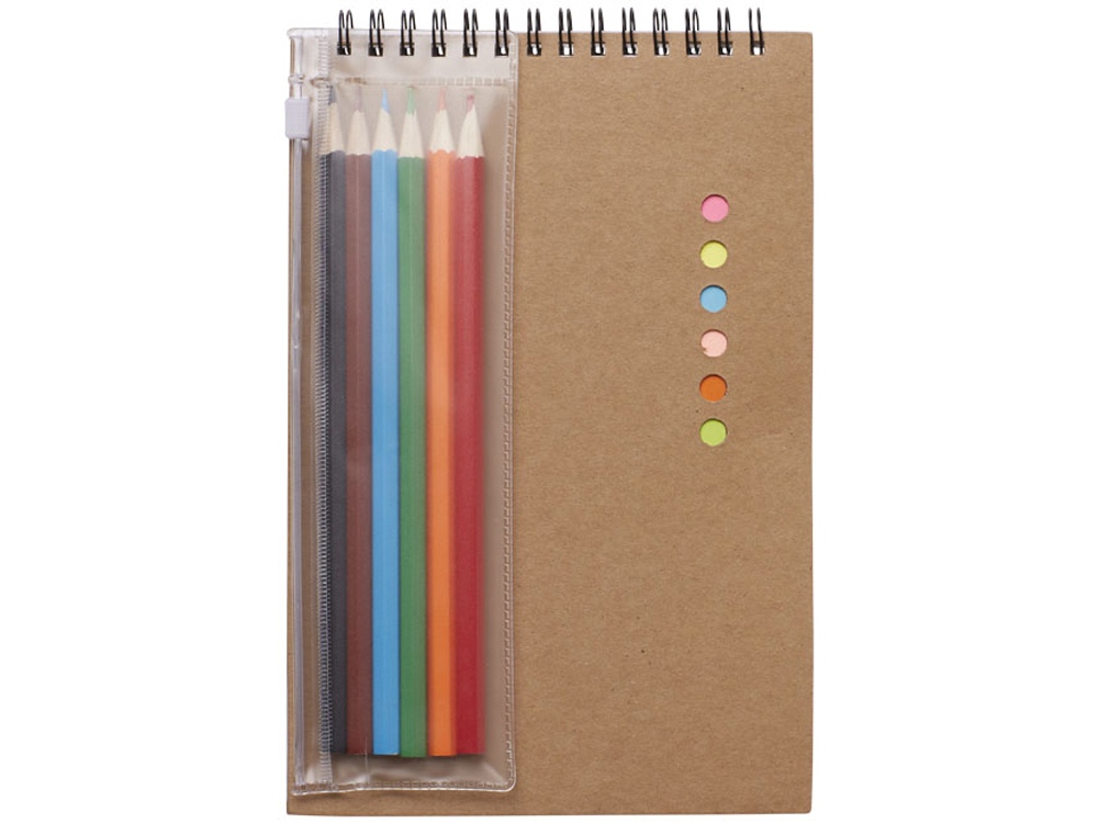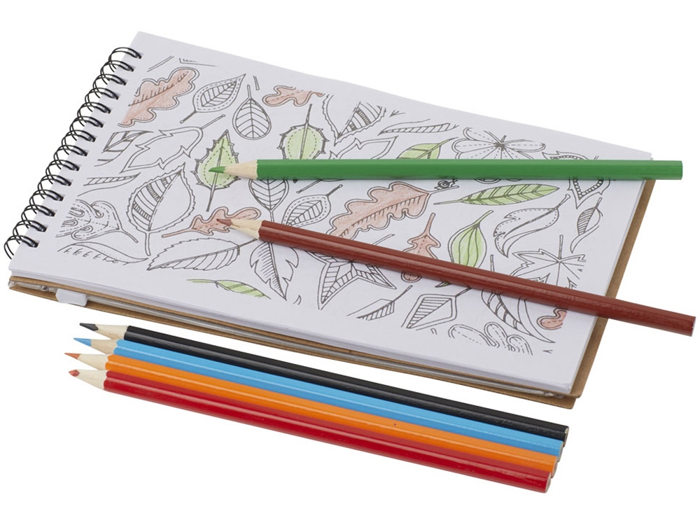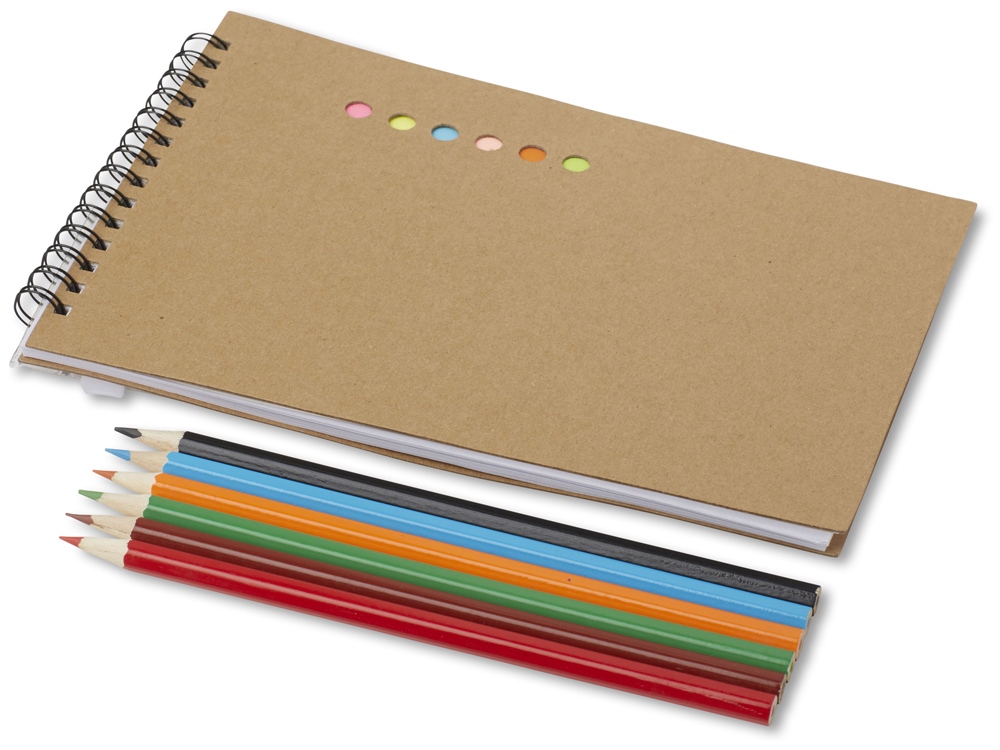 В наборе 6 небольших блоков для заметок, средний желтый блок для заметок, 10 страниц для раскрашивания, 30 пустых страниц и 6 цветных карандашей.