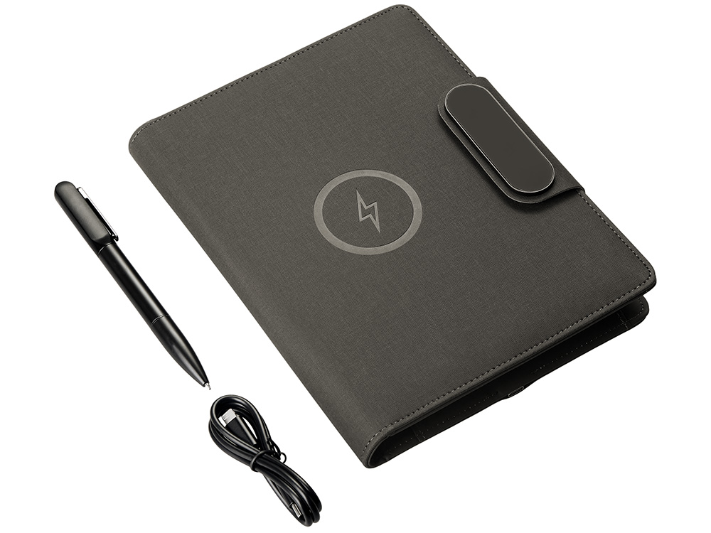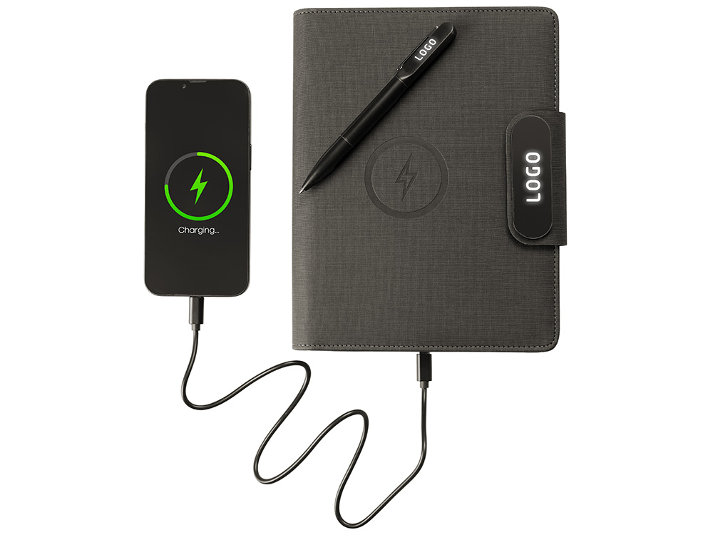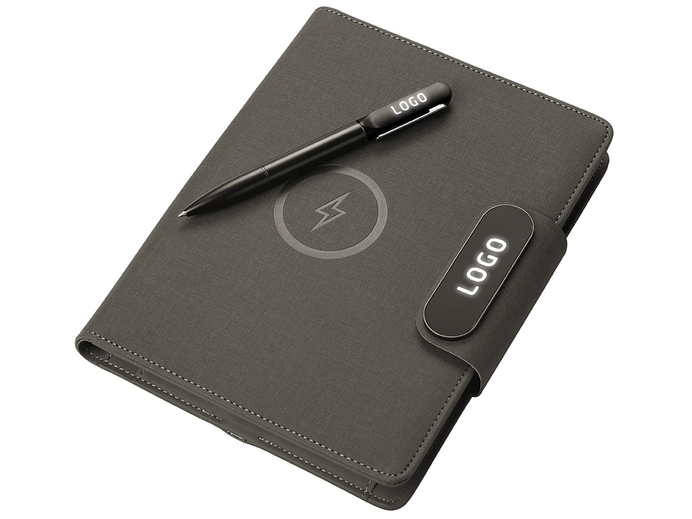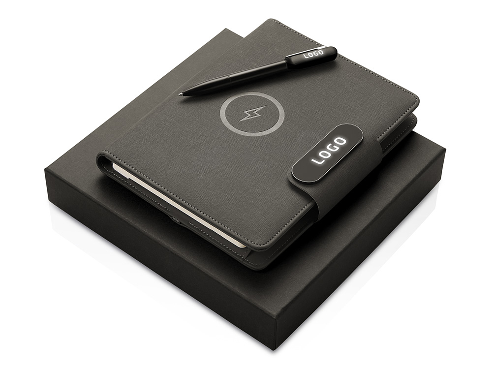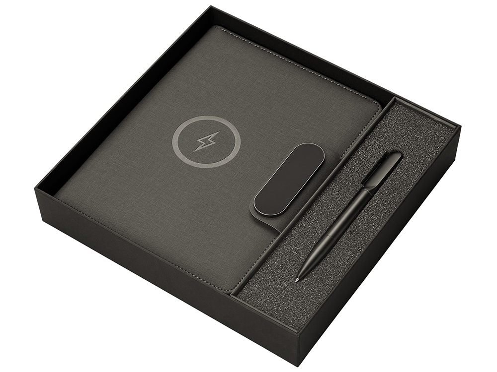 Подарочный набор "Twilight" — стильный и современный бизнес-подарок, который в полной мере воплощает идею многофункциональности. Он состоит из органайзера формата А5, с помощью которого можно заряжать гаджеты как беспроводным способом, так и через кабель, фиксировать телефон для просмотра видео или проведения конференций, хранить ручку и делать записи, а также самой металлической ручки. Клапан органайзера и в верхняя часть ручки светятся при гравировке логотипа, что делает набор стильным, а лого более ярким и заметным. Практичный и технологичный аксессуар, который в состоянии заменить сразу несколько вещей.