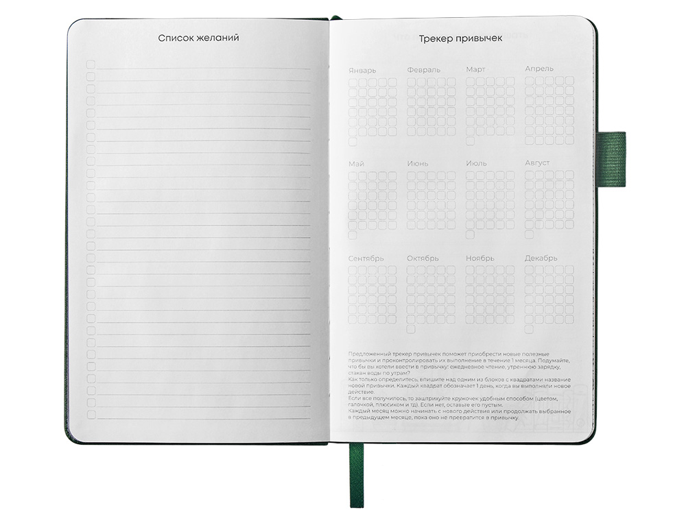 Необычный для блокнота вводный блок включает трекер привычек, списки книг и фильмов, а также 4 страницы для раскрашивания с картинками и мандалами.