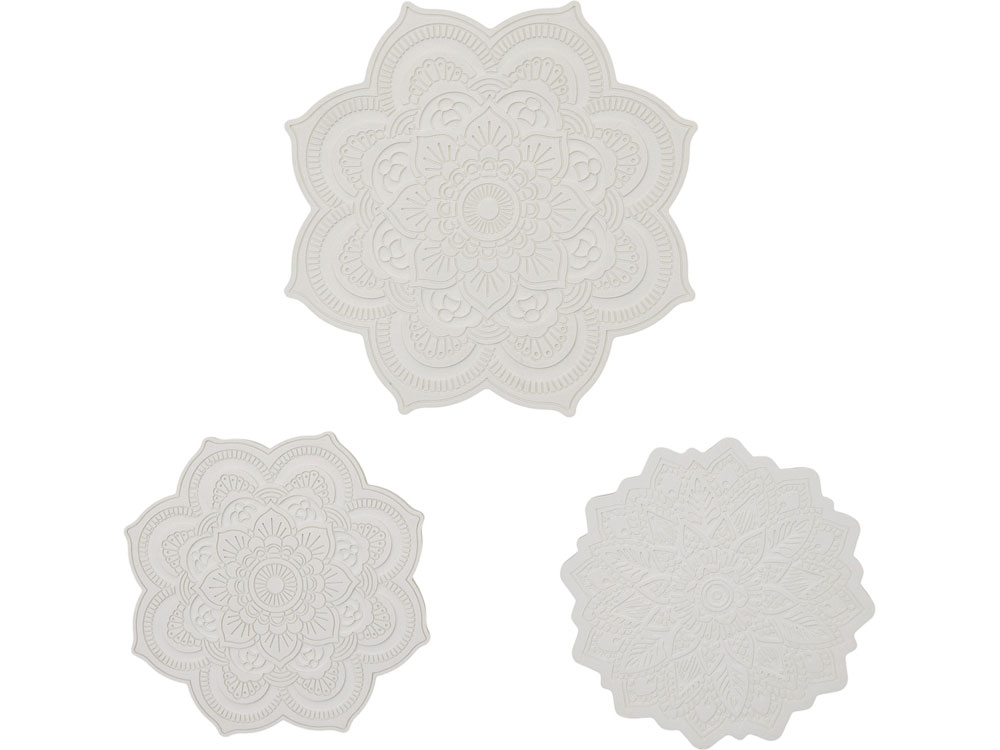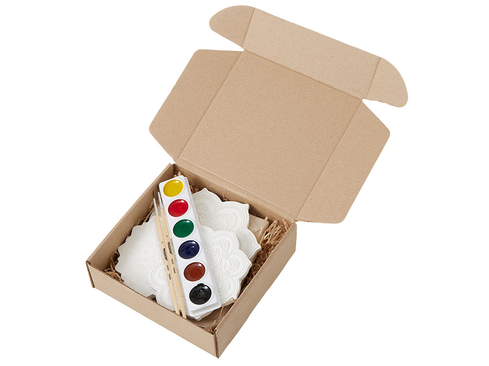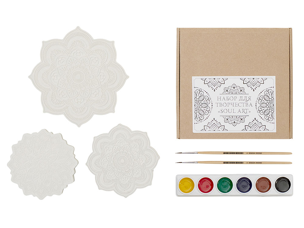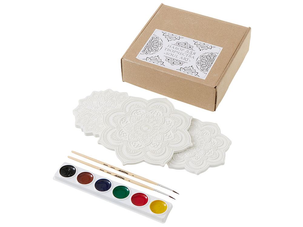 В набор входят три гипсовых фигурки мандал, а также акварельные краски и 2 кисти - более тонкая для прокраски самых тонкие деталей и чуть более толстая.