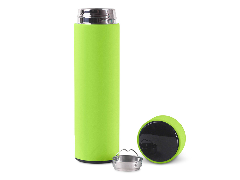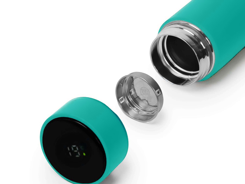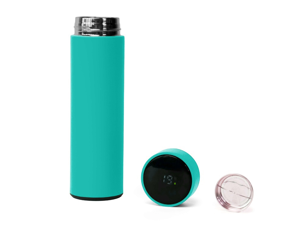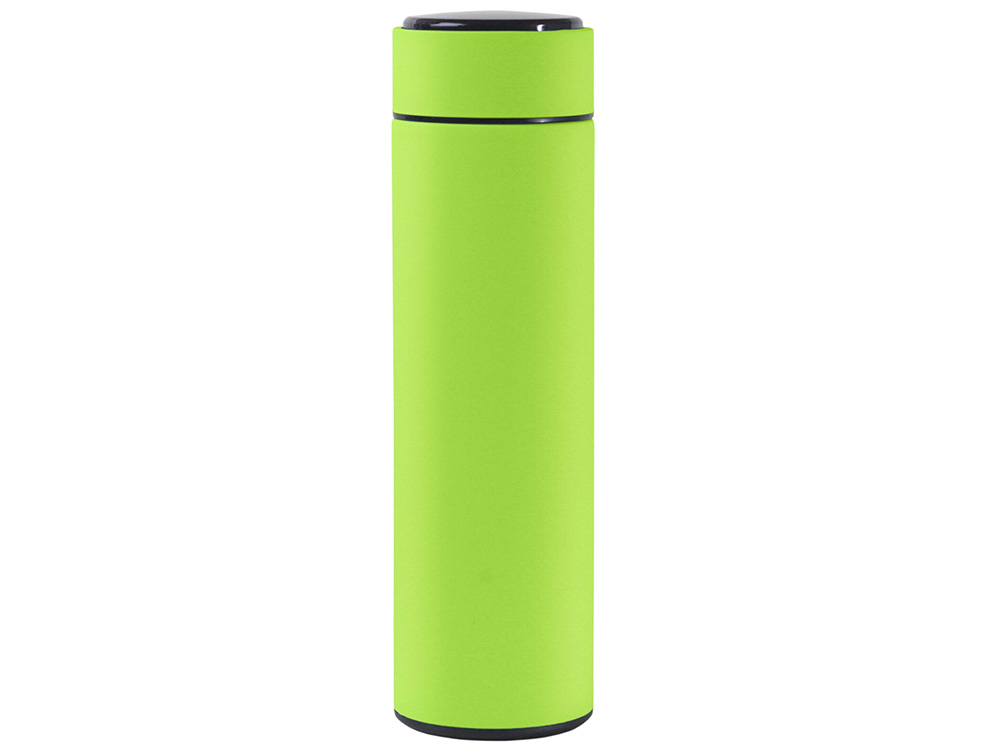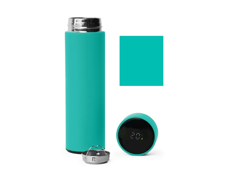 Термос из нержавеющей стали, покрытый цветным soft touch, с крышкой, в которой встроен термометр и LED дисплей, показывающий температуру внутри термоса.