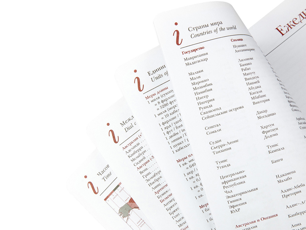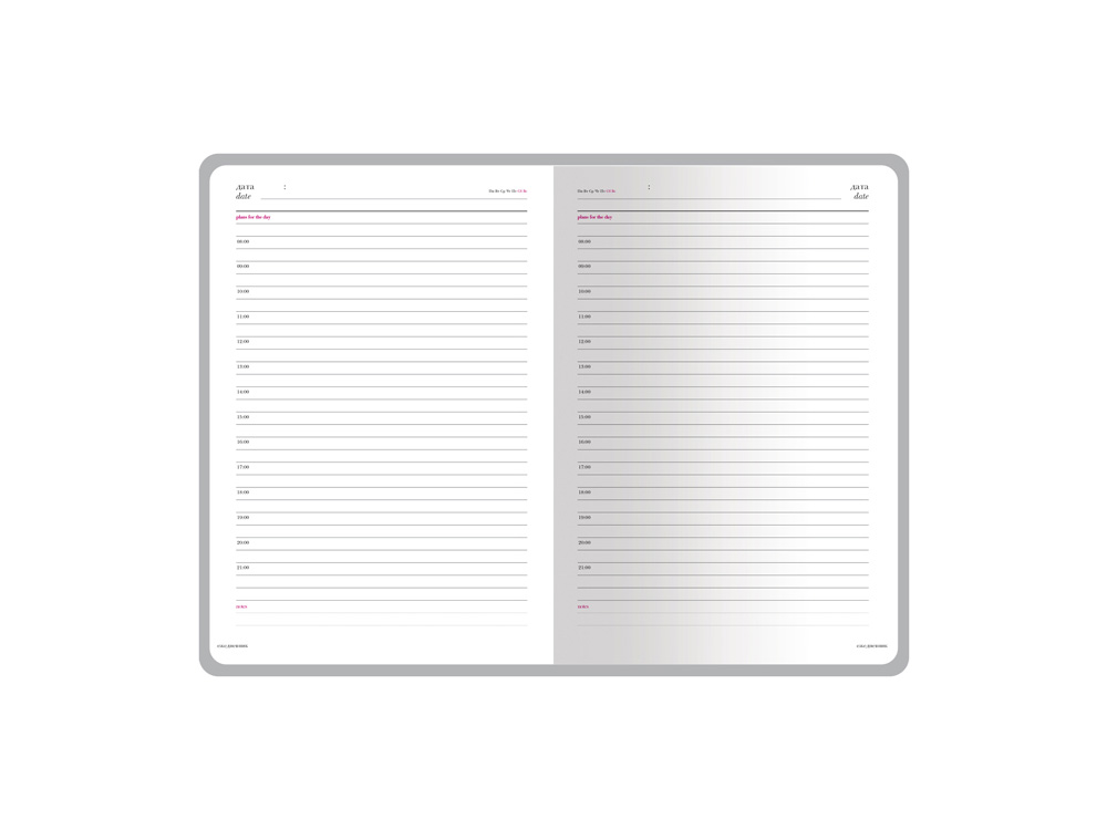 Для изготовления страниц используется качественный белый офсет повышенной плотности (70 г/кв м), который производится в Японии и подходит для всех видов чернил. Разметка блока с указанием времени позволяет планировать дела с точностью до 1 часа.