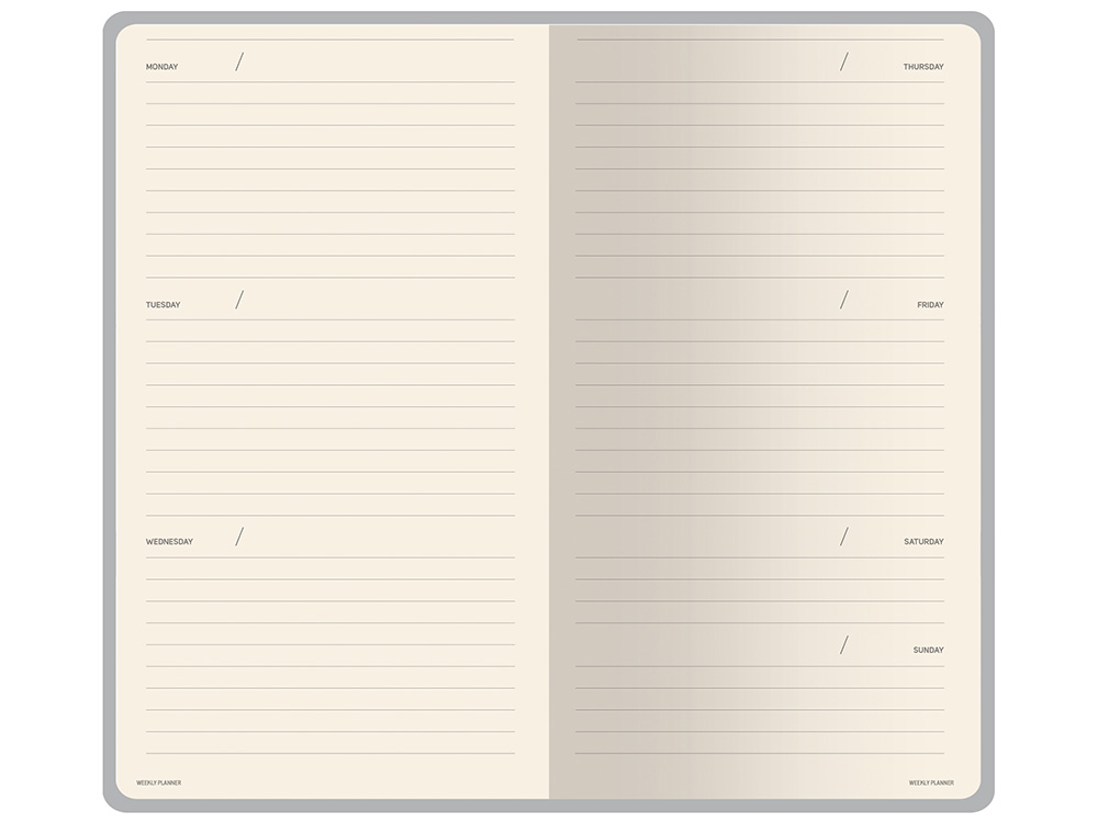 Книжный переплёт хорошо раскрывается, а скруглённые углы одновременно придают еженедельнику премиальный вид и защищают края при носке.