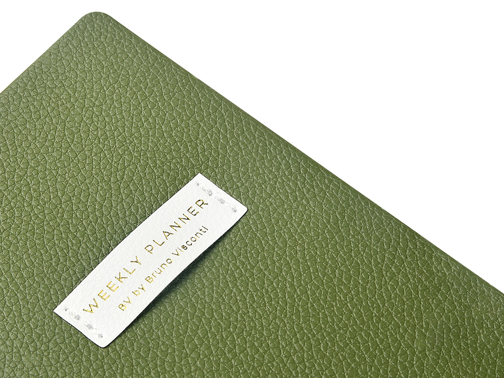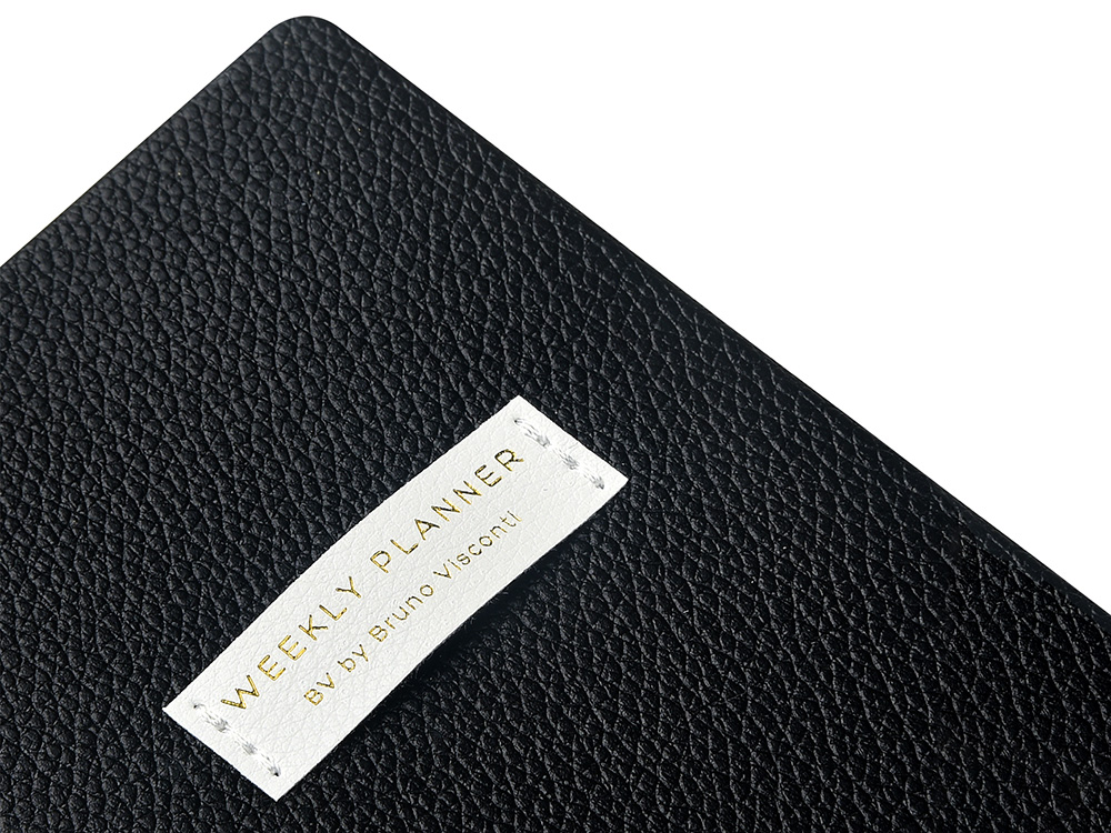 Гибкая обложка из искусственной кожи с мягкой фактурой выглядит строго, а светлая нашивка добавляет аккуратный дизайнерский акцент.