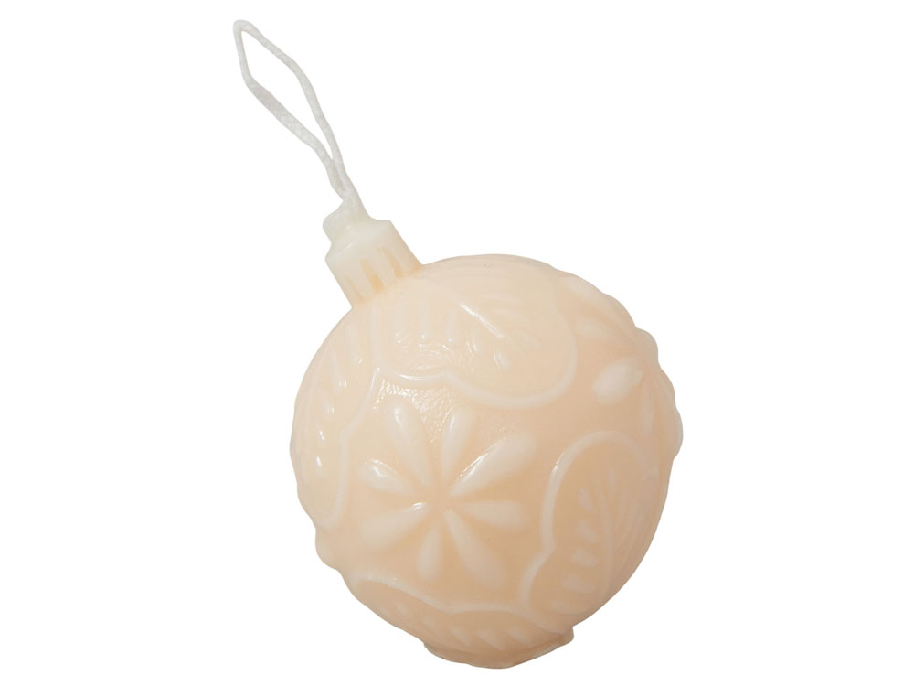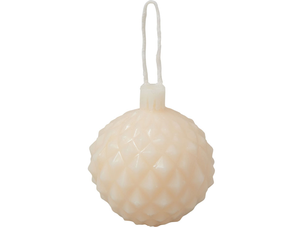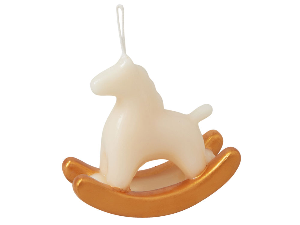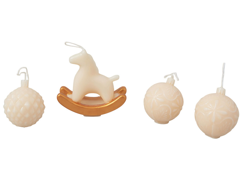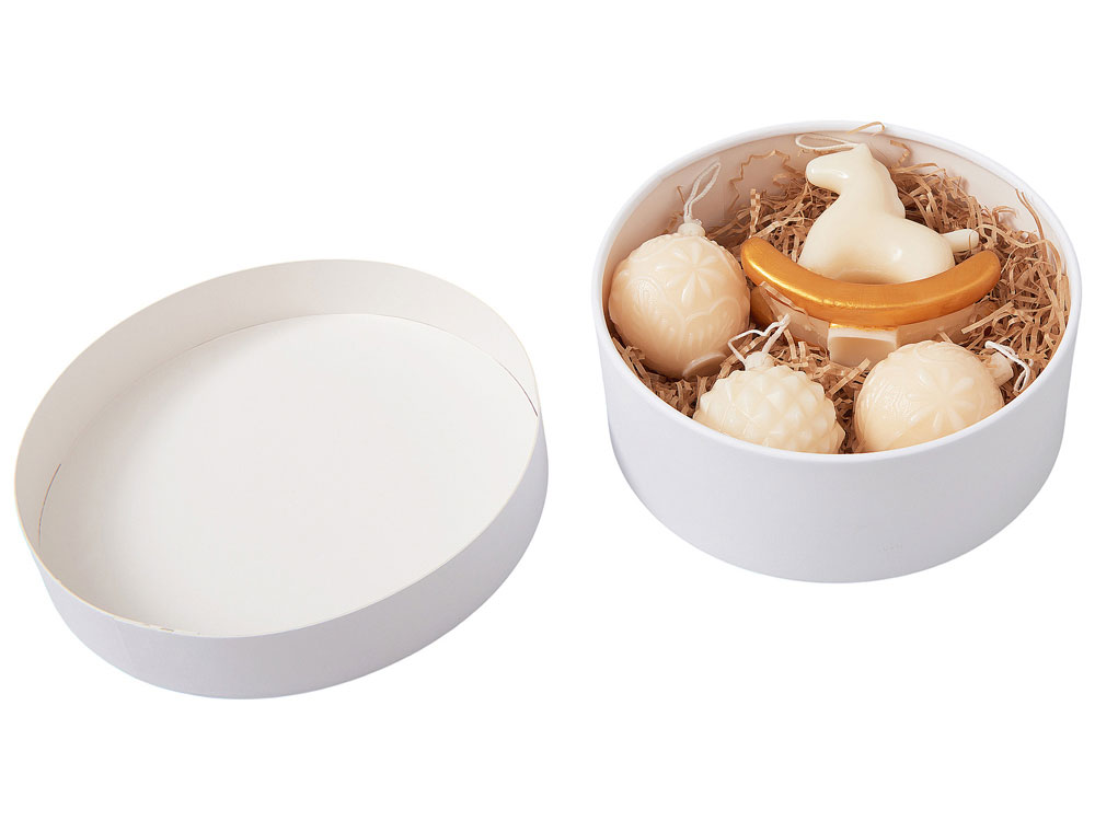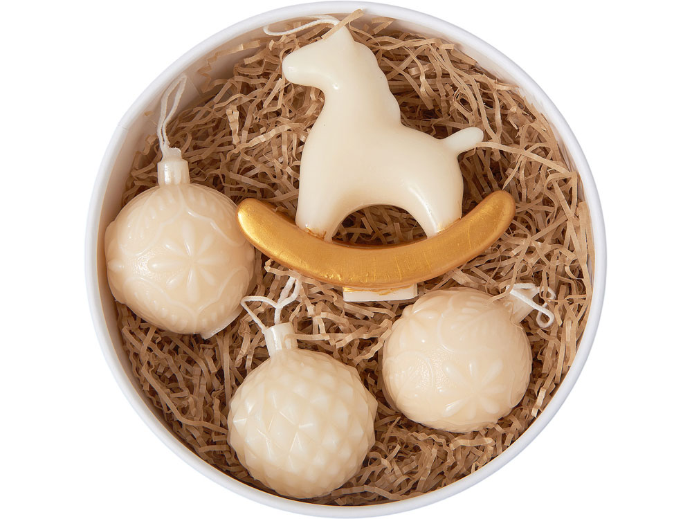 В круглой коробке с крышкой — три свечи в форме новогодних шаров и одна в виде лошадки, выполненные из утончённой смеси кокосового, соевого воска и парафина.