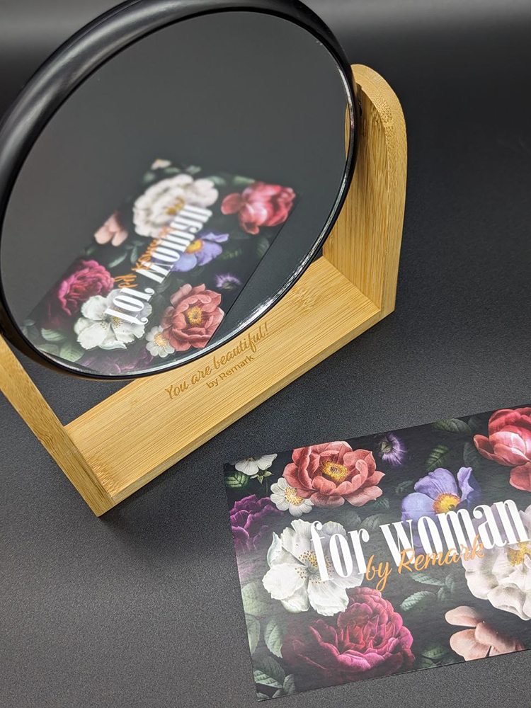 Стильное двустороннее зеркало с бамбуковой подставкой в черной рамке.