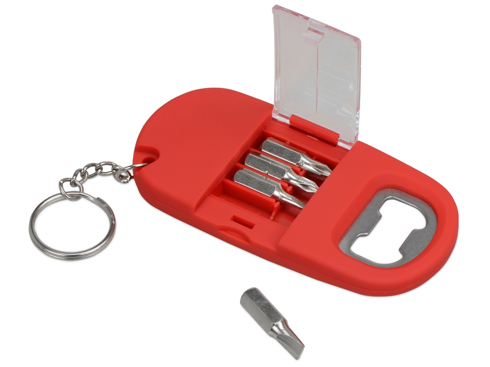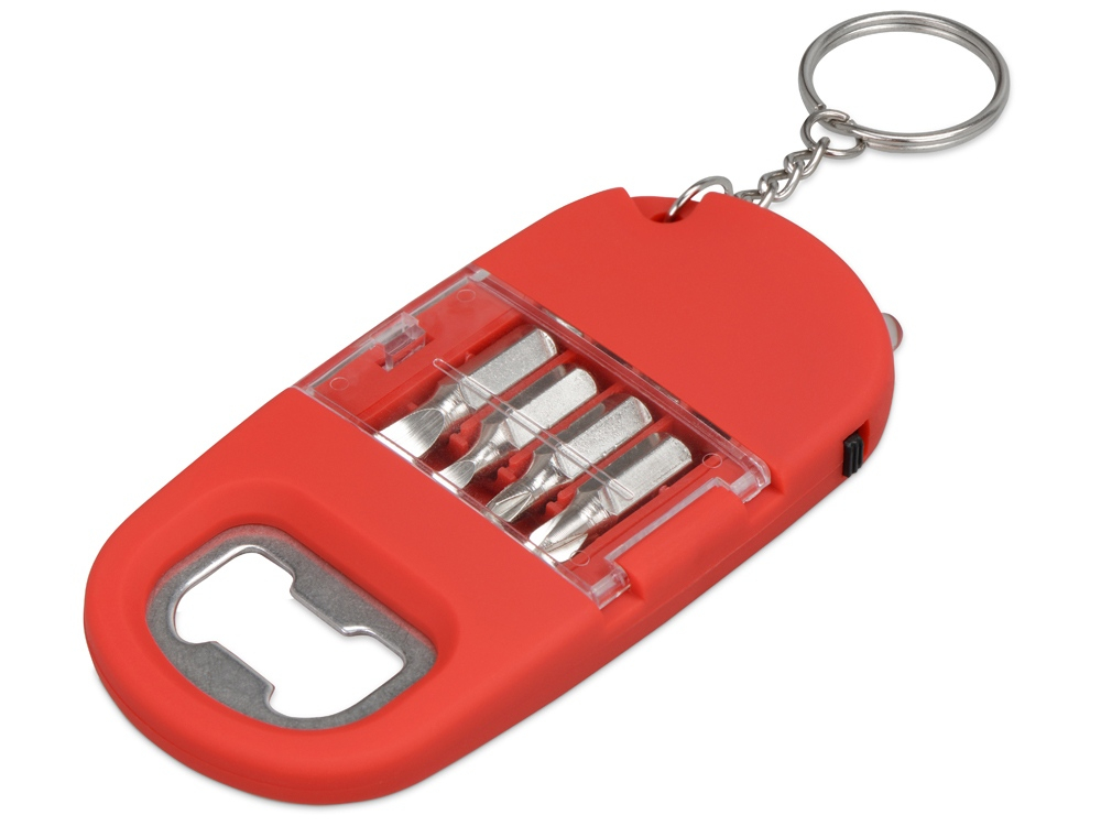 Брелок включает в себя 2 плоские и 2 крестообразные насадки, прочную металлическую открывалку и небольшой фонарик.