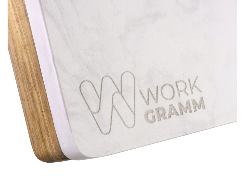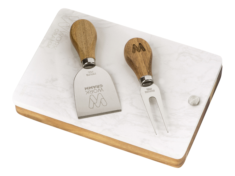 Крышка футляра, выполненная из белого мрамора, благодаря своей твердости может использоваться как разделочная доска, а благородный внешний вид делает ее идеальным вариантом для сервировки сыров и закусок.