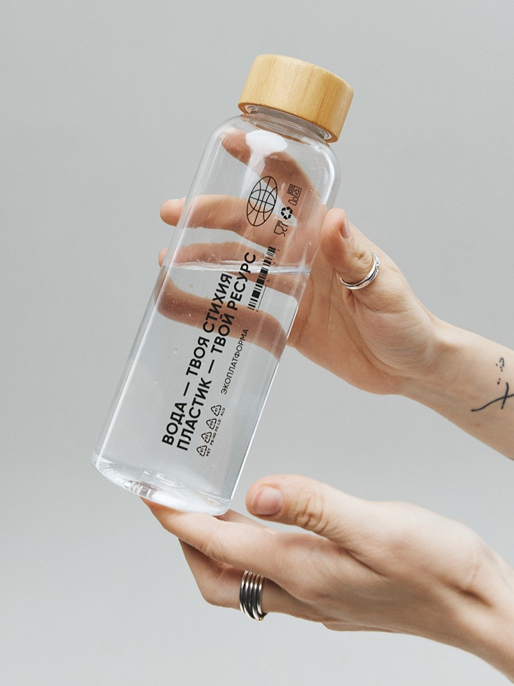 Корпус бутылки изготовлен из переработанного пластика, а крышка из бамбука.