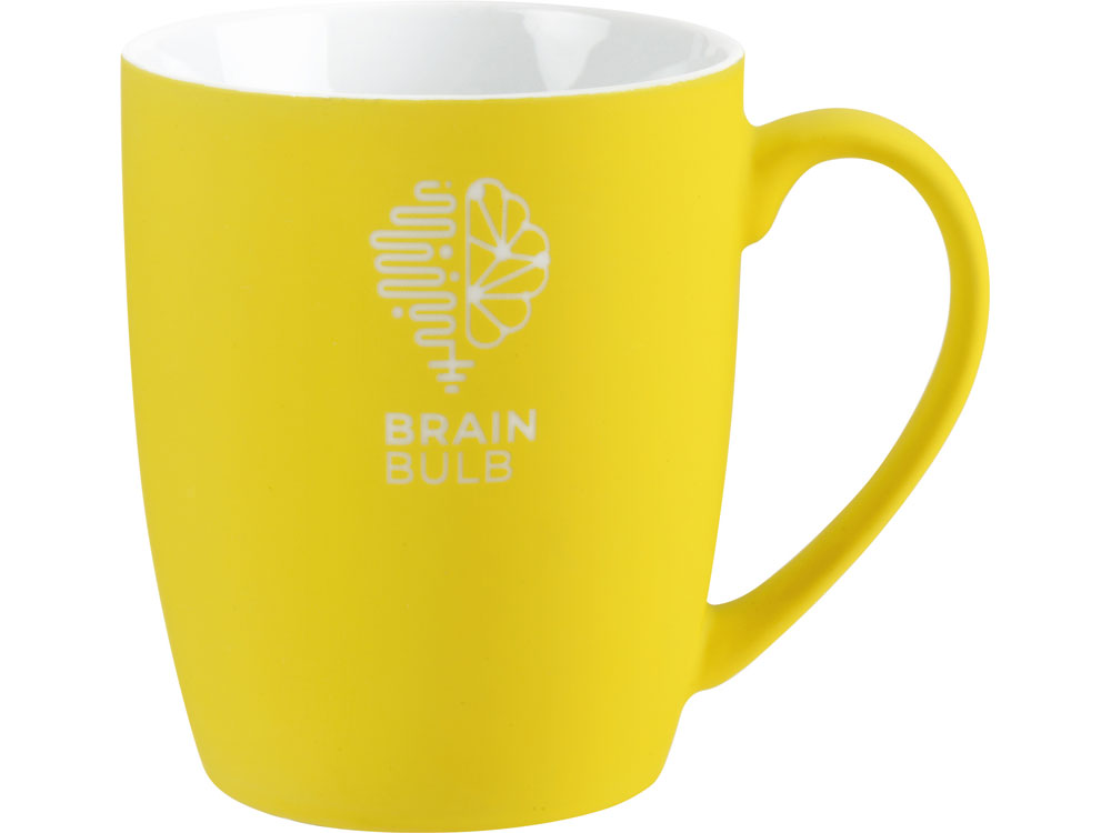 Кружка из фарфора с бархатистым покрытием яркого цвета. Белый фарфор обнажается при гравировке на изделии.