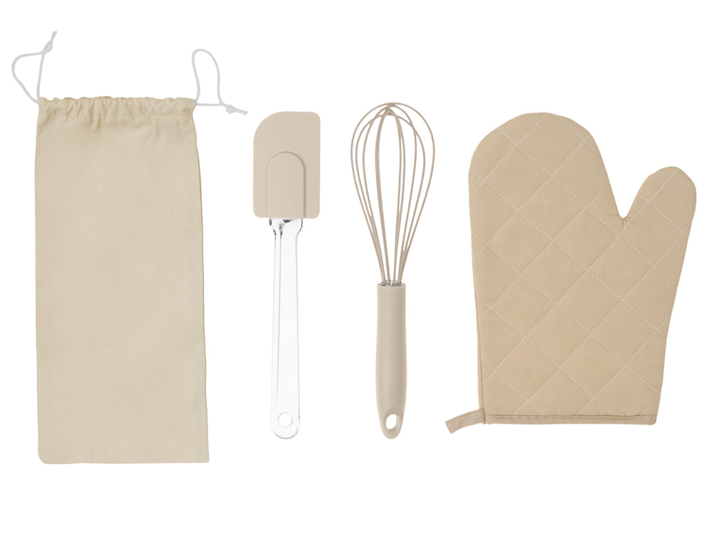 Набор Canele состоит из трёх предметов, без которых не обходится приготовление ни одного пирога или торта: венчика для взбивания яиц или крема, лопатки и прихватки для горячего.