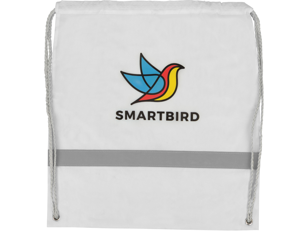 Рюкзак-мешок со светоотражающей полосой и серыми шнурками.