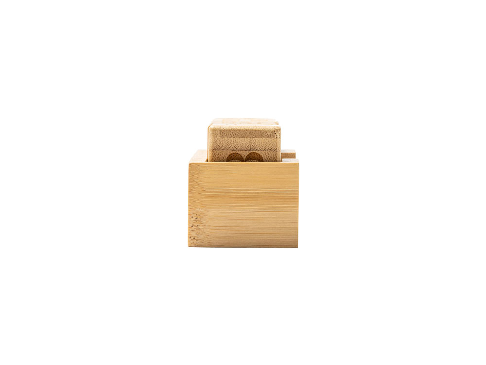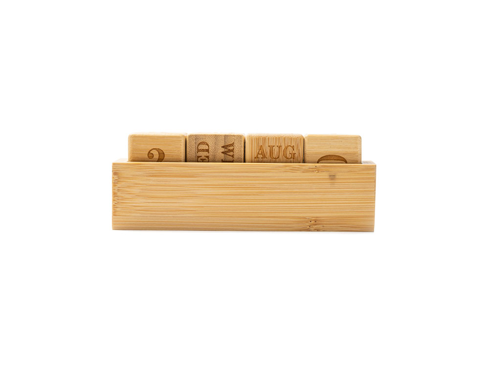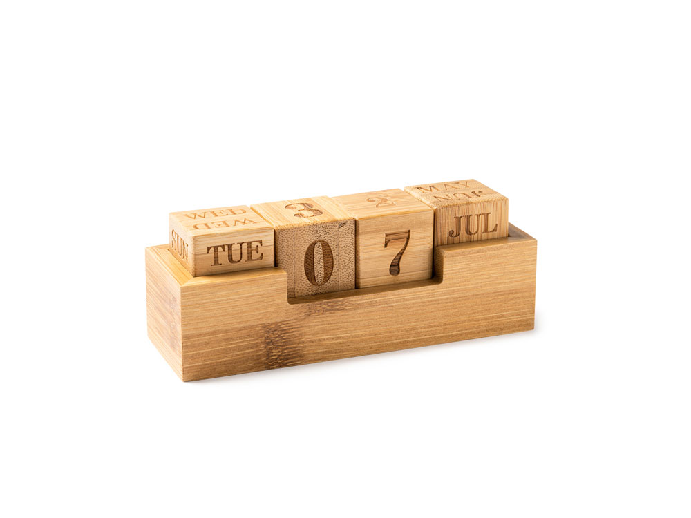 "Вечный" настольный календарь из бамбука, состоящий из одной подставки и четырех блоков с гравировкой.