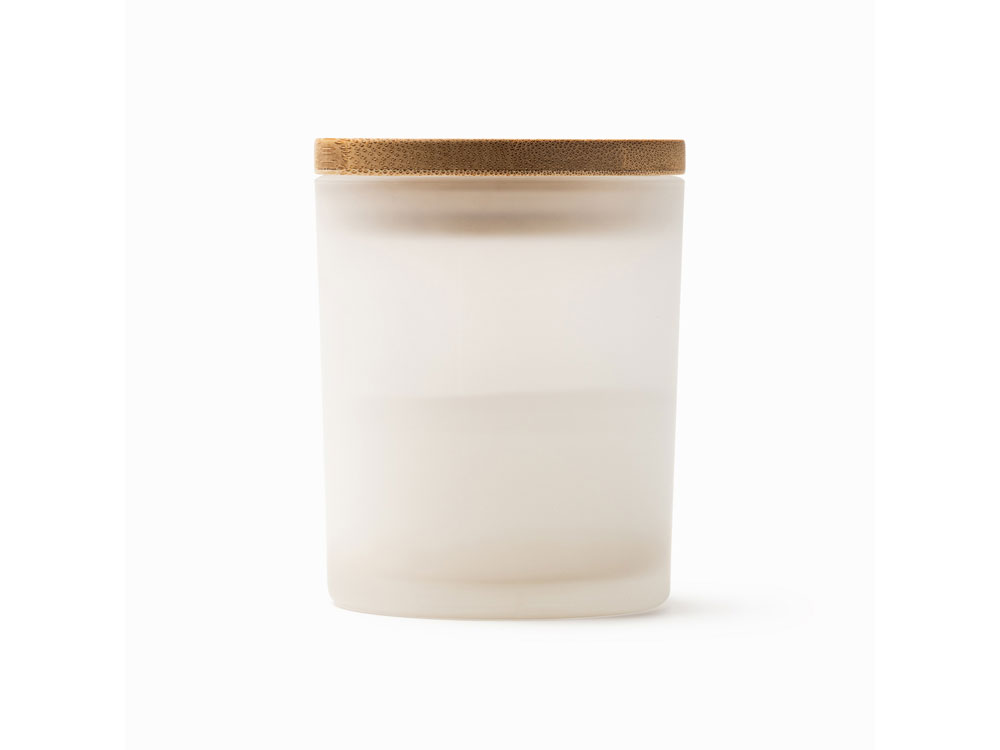 Ароматическая свеча в подсвечнике из полупрозрачного стекла с бамбуковой крышкой.