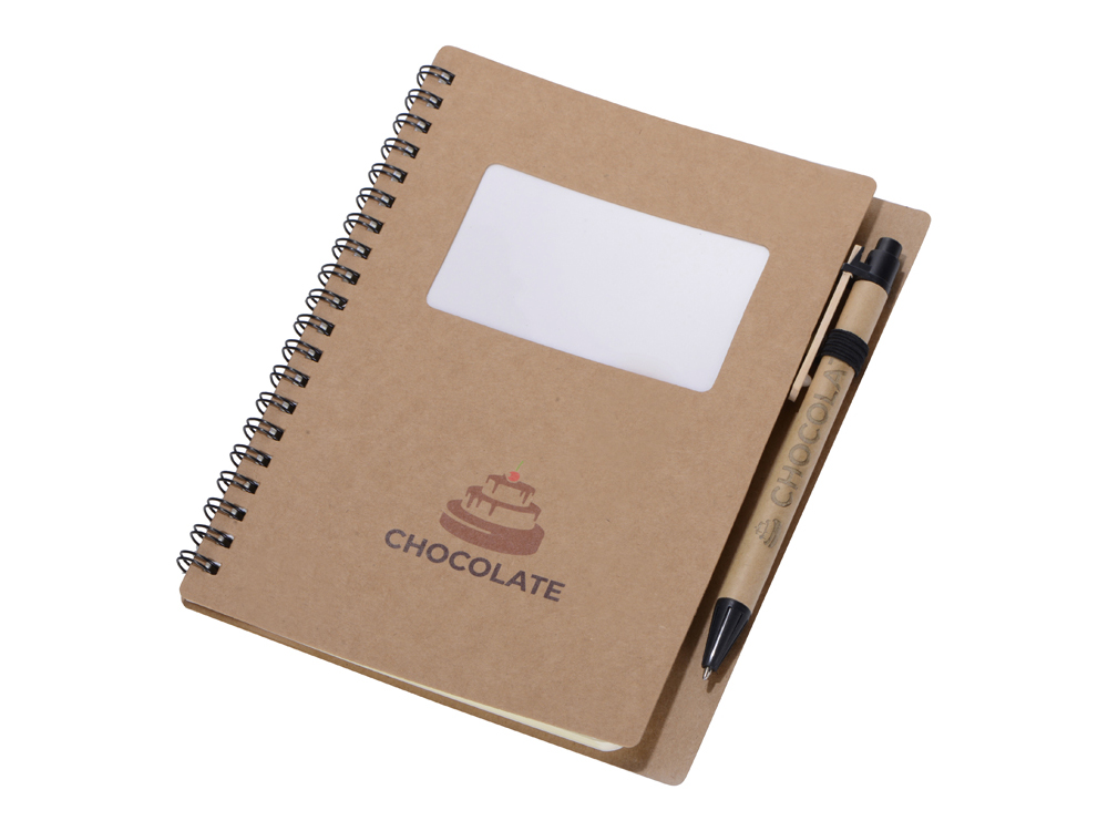 Блокнот и ручка из крафтового картона. В обложке блокнота предусмотрено окошко, в которое можно поместить вашу визитную карточку или полиграфическую вставку.