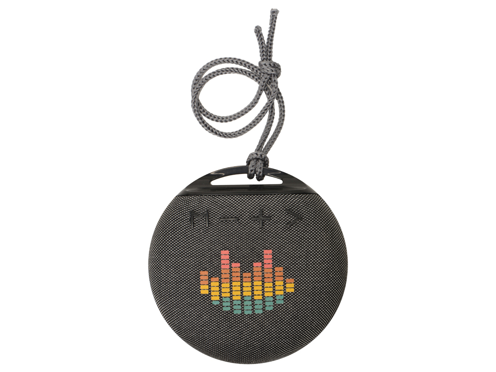 Колонка обтянута акустической тканью, проигрывает музыку со стандартной USB флешки или micro SD карты.