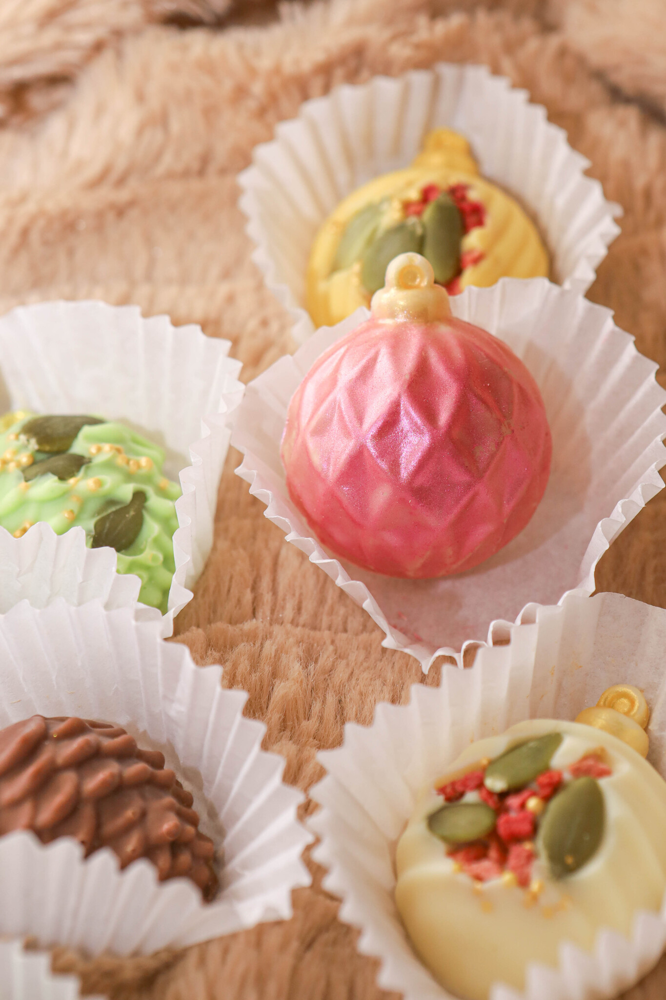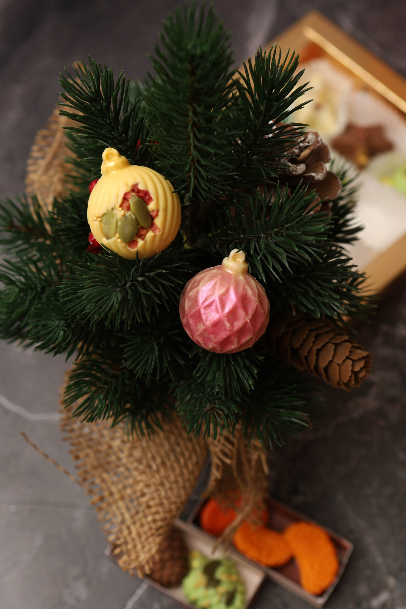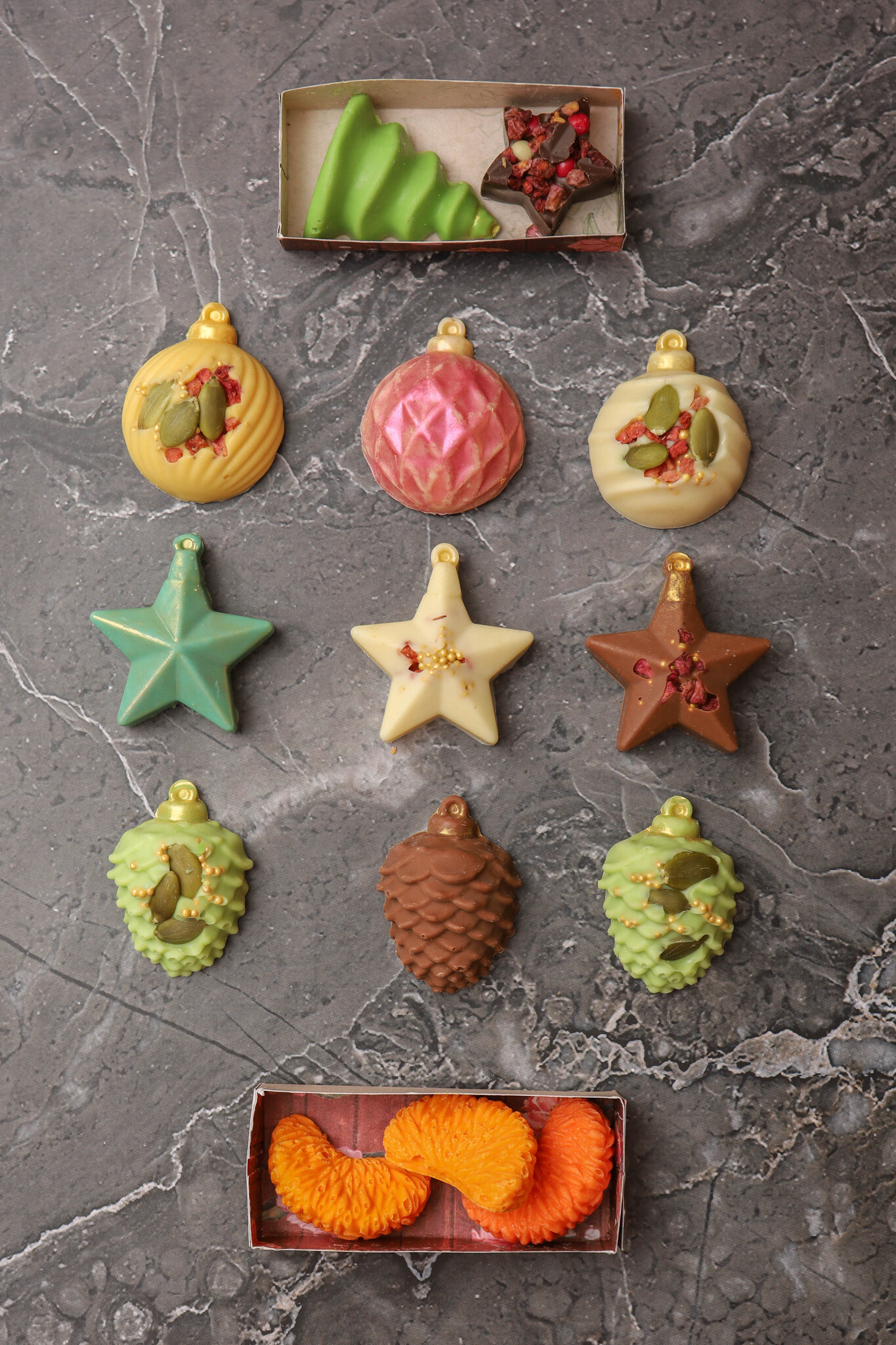 Конфеты в форме новогодних елочных игрушек из шоколадной глазури.