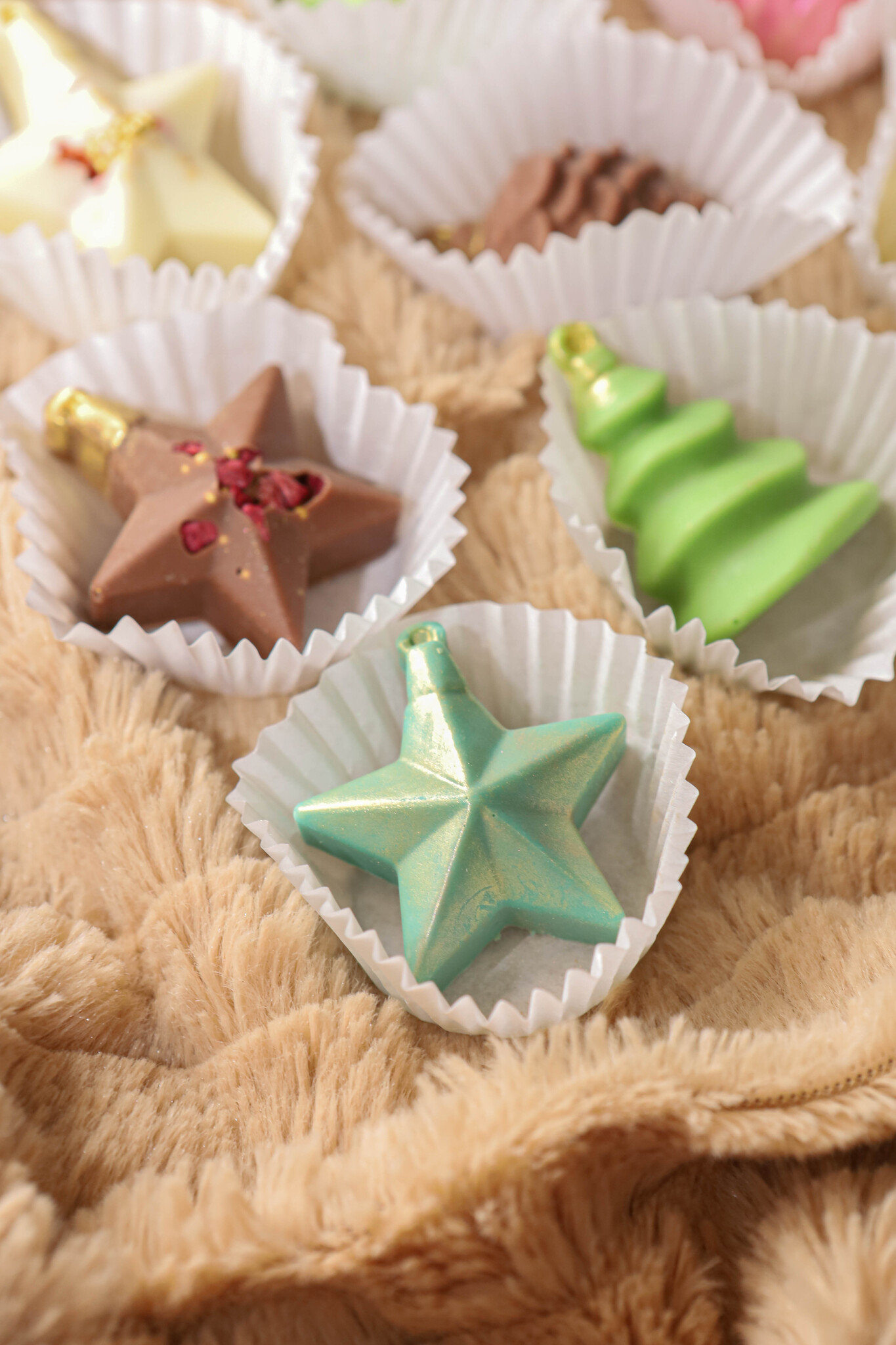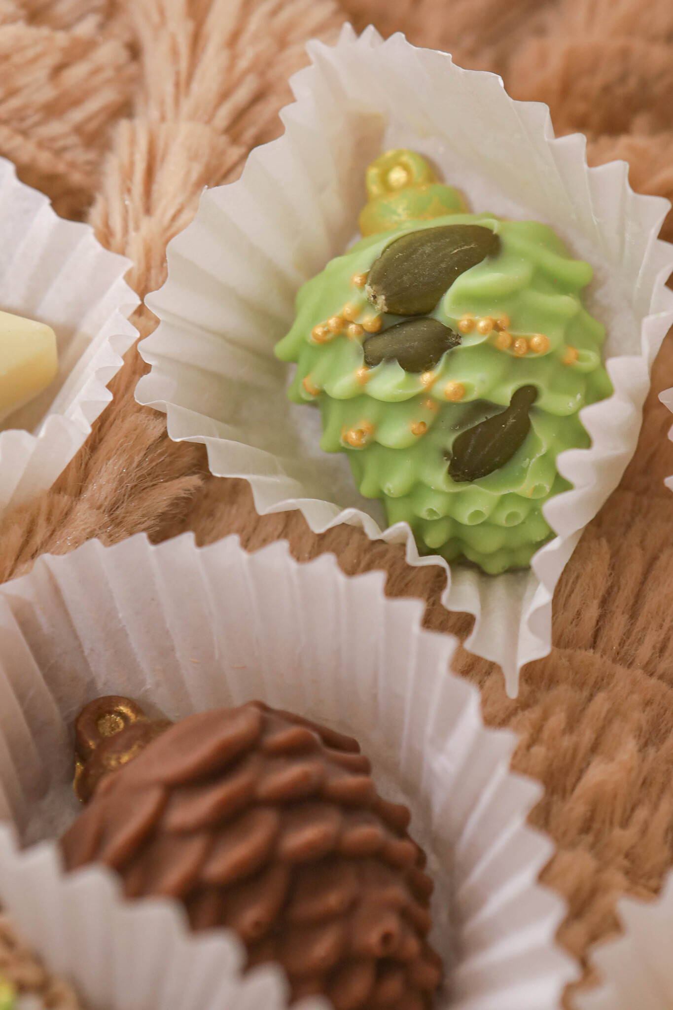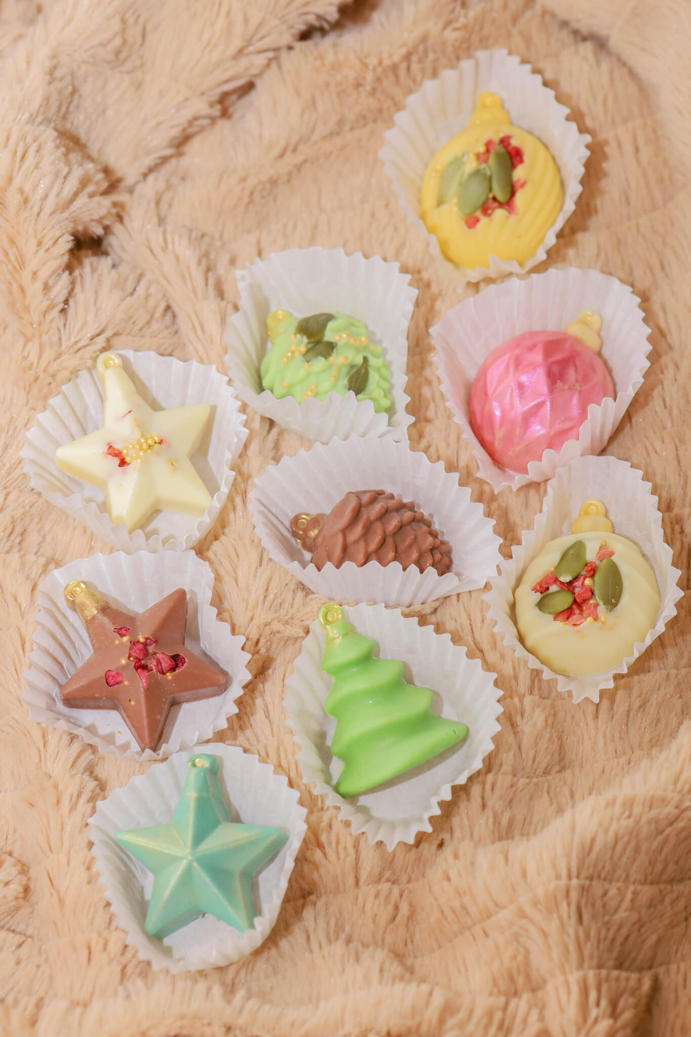 Конфеты в форме новогодних елочных игрушек из шоколадной глазури.