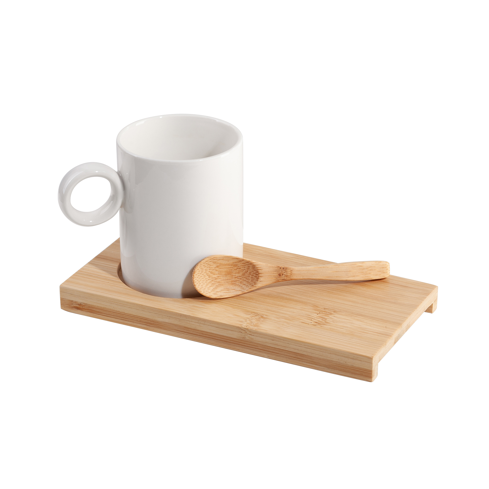 . Чайный набор, состоящий из чашки и подносика с ложкой — это удачный вариант подарка, который позволяет выделиться на фоне остальных компаний. Это не просто кружка, это набор, который можно очень удачно обыграть, соединив три предмета каким-либо общим девизом. Интересен он и с точки зрения текстур: сочетание гладкого фарфора с бамбуком заворожит любого кинестетика.