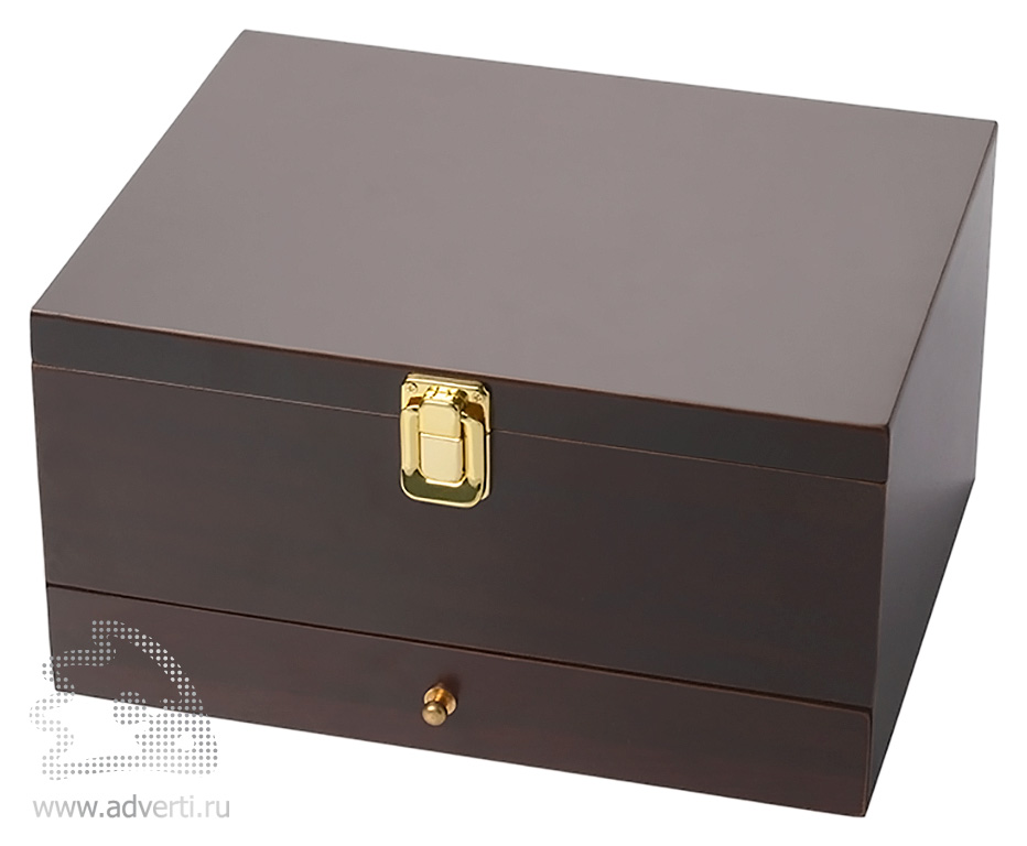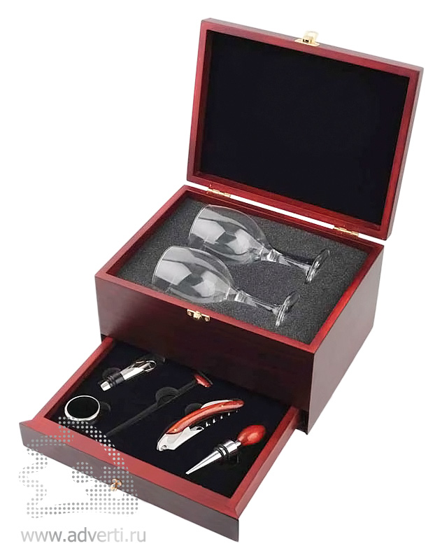 Нанесение производится на шильдик, расположенный на верхней крышке. Шильд — это табличка, чаще всего металлическая, которая прикрепляется к уже готовому изделию, чтобы его персонализировать. Используется шильд в случае, если изделие настолько дорого или настолько сложно для брендирования, что проще запечатать табличку. Рукоятки приспособлений выполнены с включениями дерева, что интересно сочетается с шкатулкой, объем бокалов — 200 мл каждый, материал — стекло. Шубер из картона украшен нанесением полноцветной картинки от производителя. Логотип на шильдике гравируется.