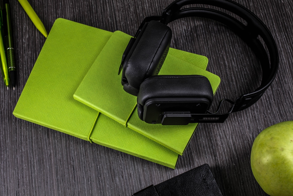 На фото: ежедневники PortobelloSummertime» форматов А5 и А6, наушники Rombica «MySound BH-05».