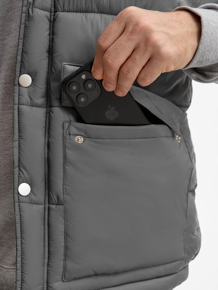 Утепленные накладные карманы: два на кнопках с вертикальным входом и два с боковым — итого 4 кармана.