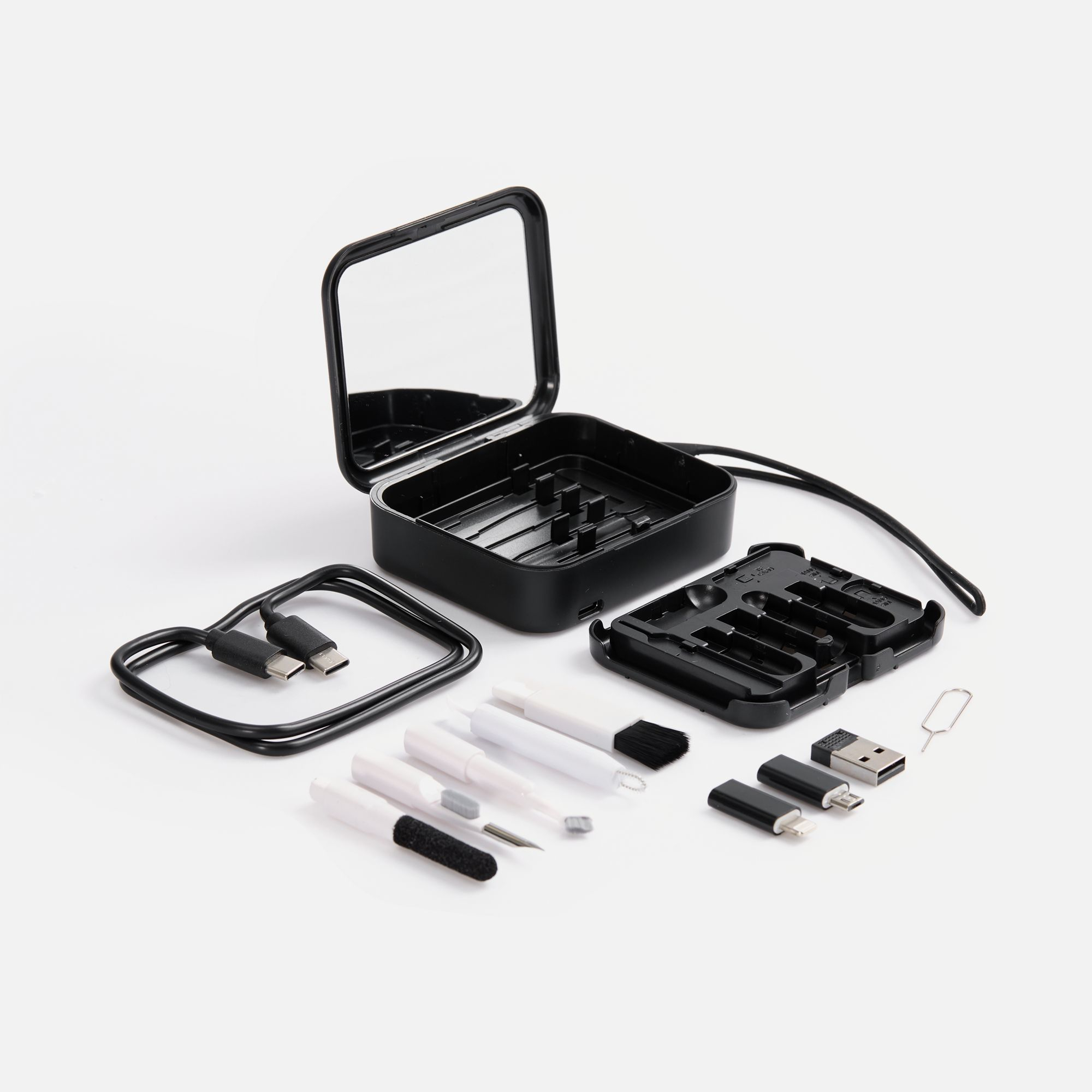 - аксессуары для чистки гаджетов: щетка с наклонной щетиной, перо для чистки со щеткой для наушников, насадка для чистки футляра от наушников, двусторонняя насадка для чистки разъемов зарядки, щетка с мягкой щетиной