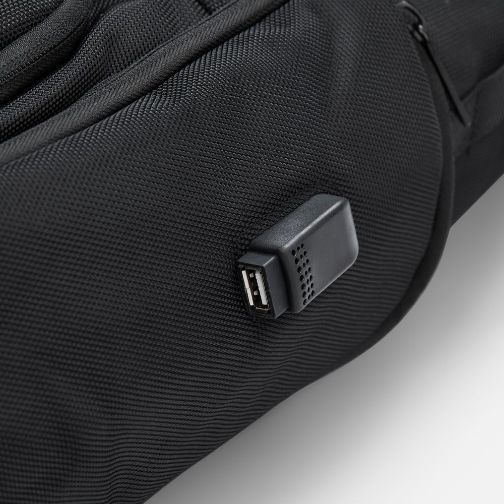 Внешний USB-порт для зарядки гаджетов (внутри бокового кармана — провод для подключения).