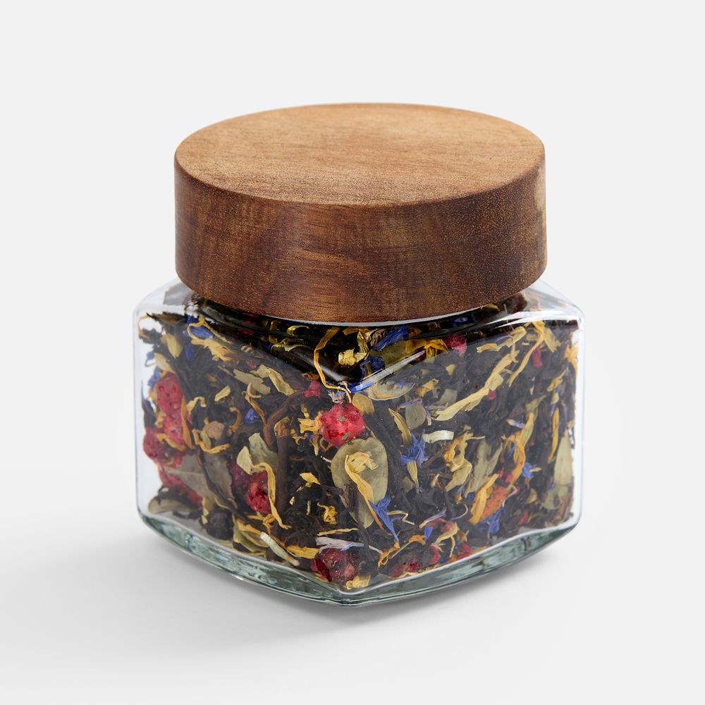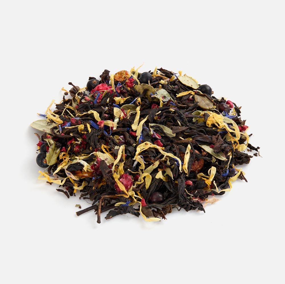 Состав: чай черный индийский листовой, ягоды брусники сублимированные, ягоды облепихи сублимированные, кусочки малины сублимированные, плоды можжевельника, мелисса, лепестки календулы, лепестки василька, листья брусники, боярышник, аромат лесных ягод.