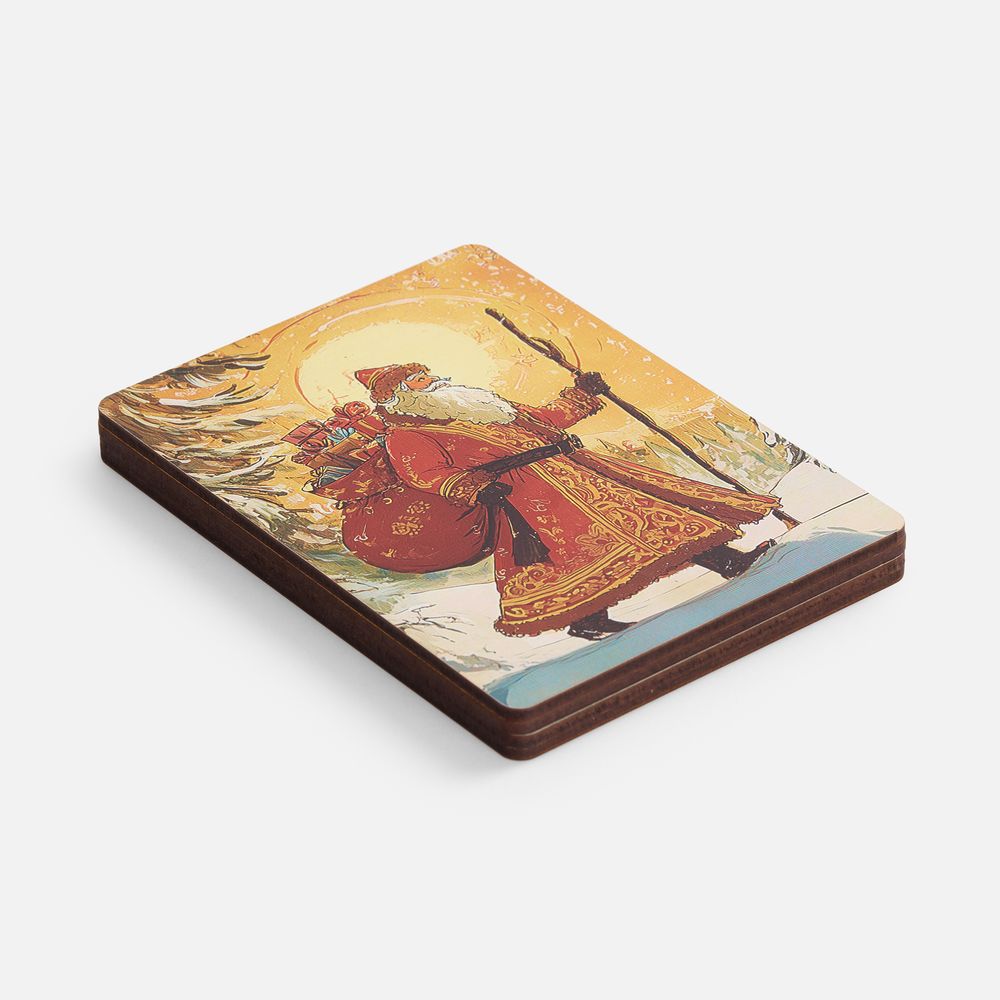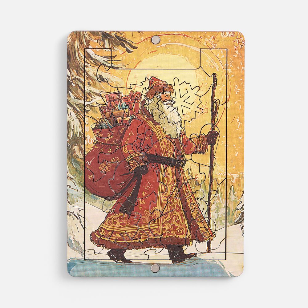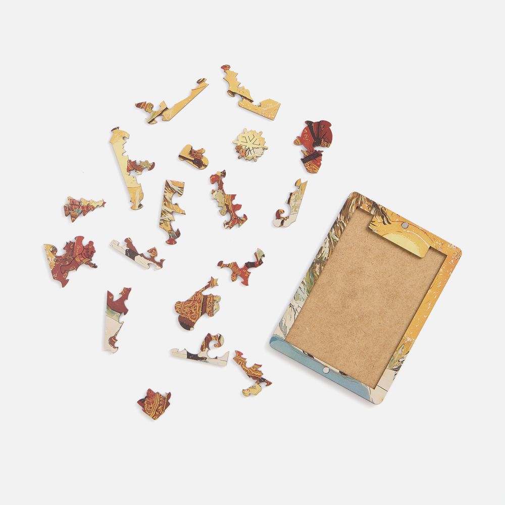 Пазлы изготовлены из дерева, а сама новогодняя картинка оформлена в открыточном ретростиле.