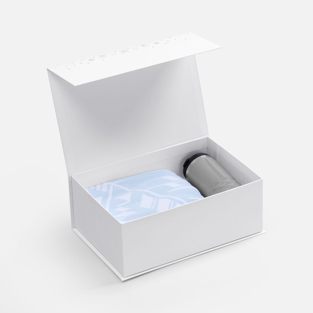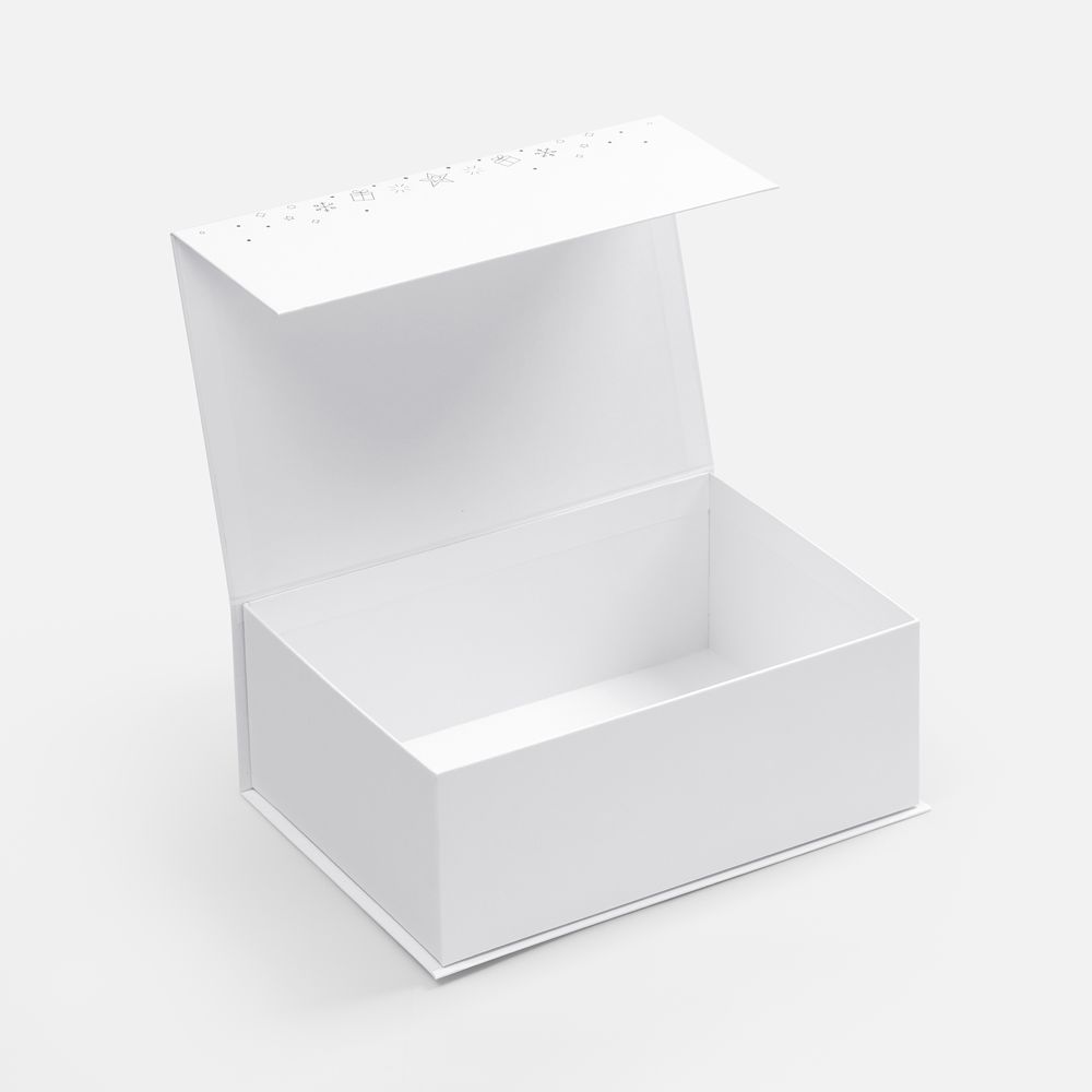 Коробка выполнена из переплетного картона толщиной 1,5 мм, кашированного бумагой с тиснением серебристой фольгой.