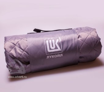 Одна из сторон пледа полиэстеровая, вторая — флисовая. Поставляется в стяжке в тон пледа. Плед украшается вышивкой на шевроне или же шелкографией на стяжке, потому что само изделие имеет неровную стеганую поверхность с обеих сторон.
