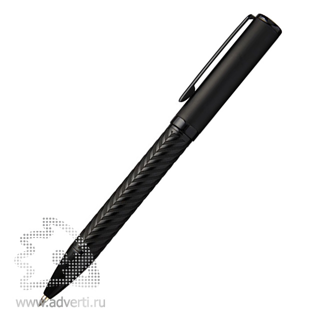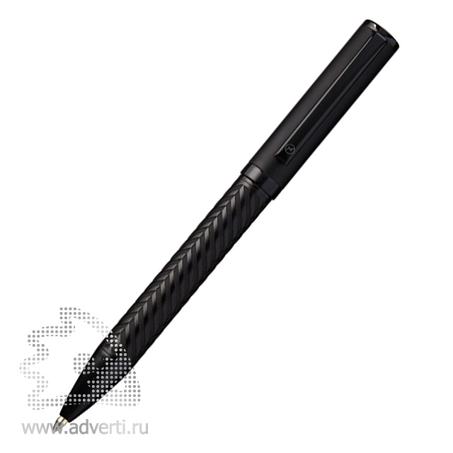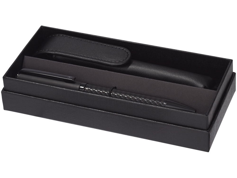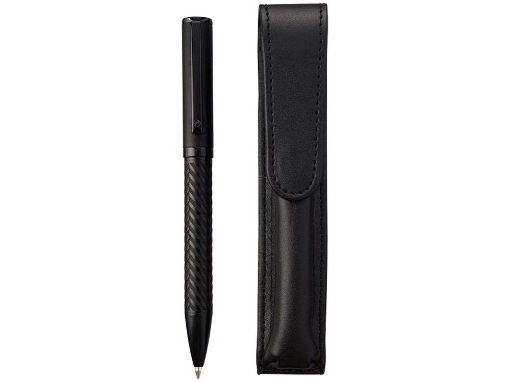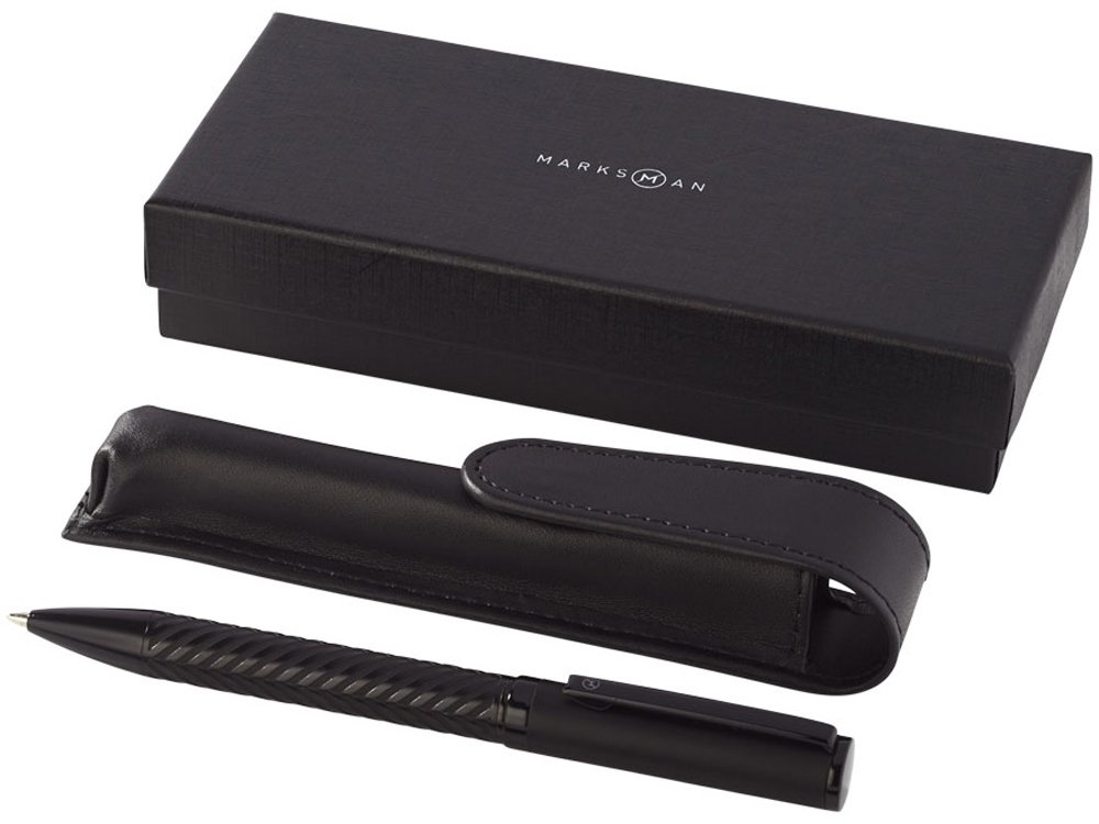 На корпусе выгравирован узор рифленый. Набор состоит из ручки и чехла и упакован в подарочную коробку Marksman® для двух предметов. В комплекте — стержень для ручки.