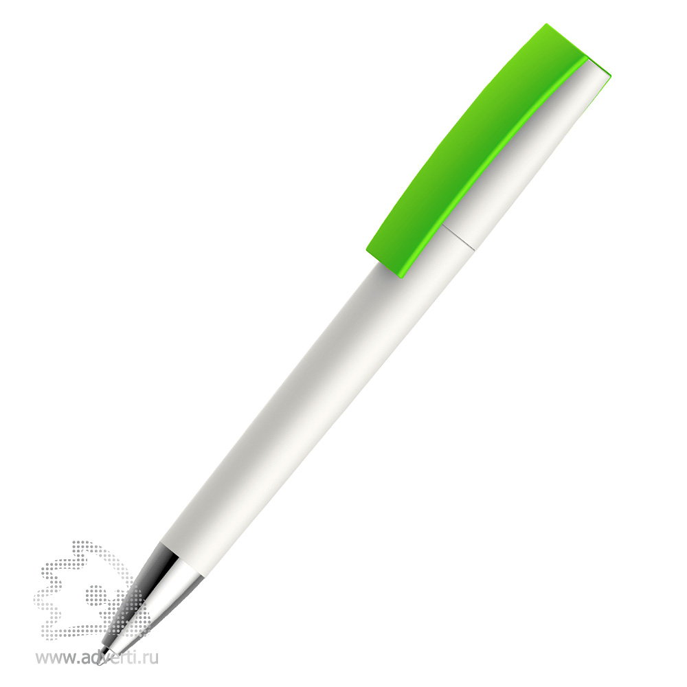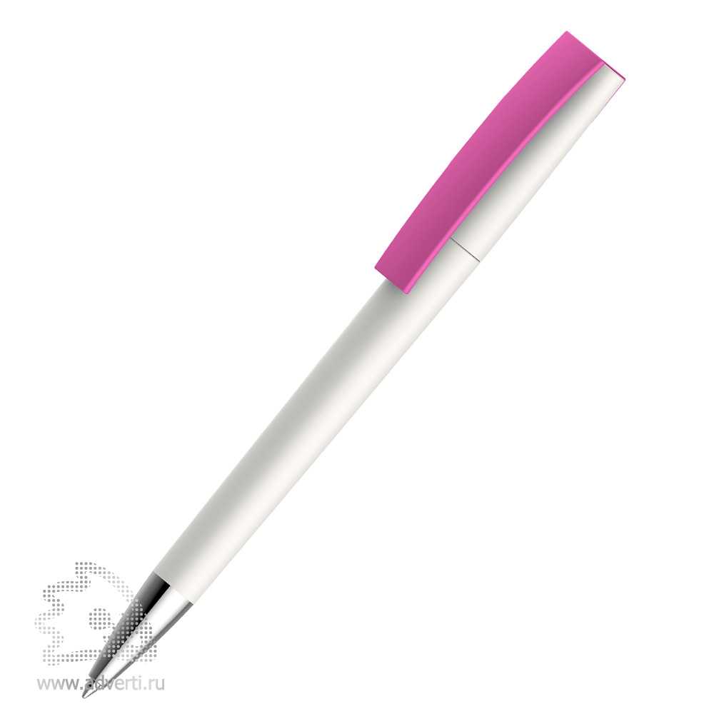Белая ручка с цветным контрастным клипом и серебристым носиком. Стержень сменный. Цвет клипа можно прекрасно сочетать с цветом вашего лого.