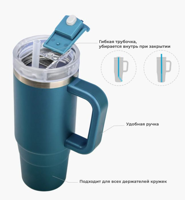 Кружка предназначена как для левшей, так и для правшей: ее крышка скручивается как в левую, так и в правую сторону. Широкое горло термокружки позволяет ее легко мыть, трубочка и мини-ершик для чистки трубочки – в комплекте. Формат подходит для подстаканника в машине.