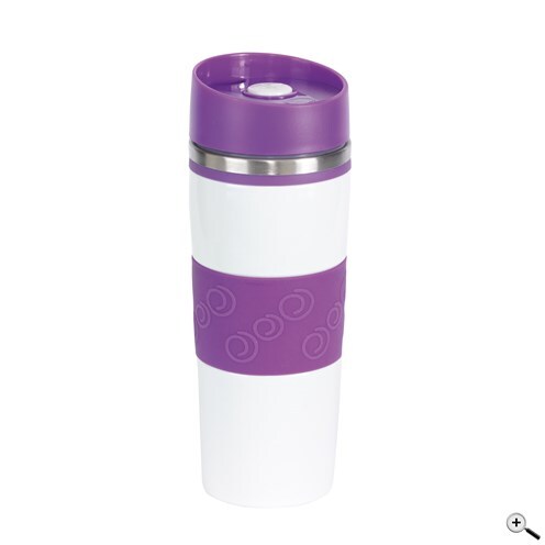 Термокружка с двойными стенками из нержавеющей стали, цветная откручивающаяся крышка, кнопка OPEN/CLOSE и клапан для питья, цветной, силиконовый ободок и прорезиненное дно.