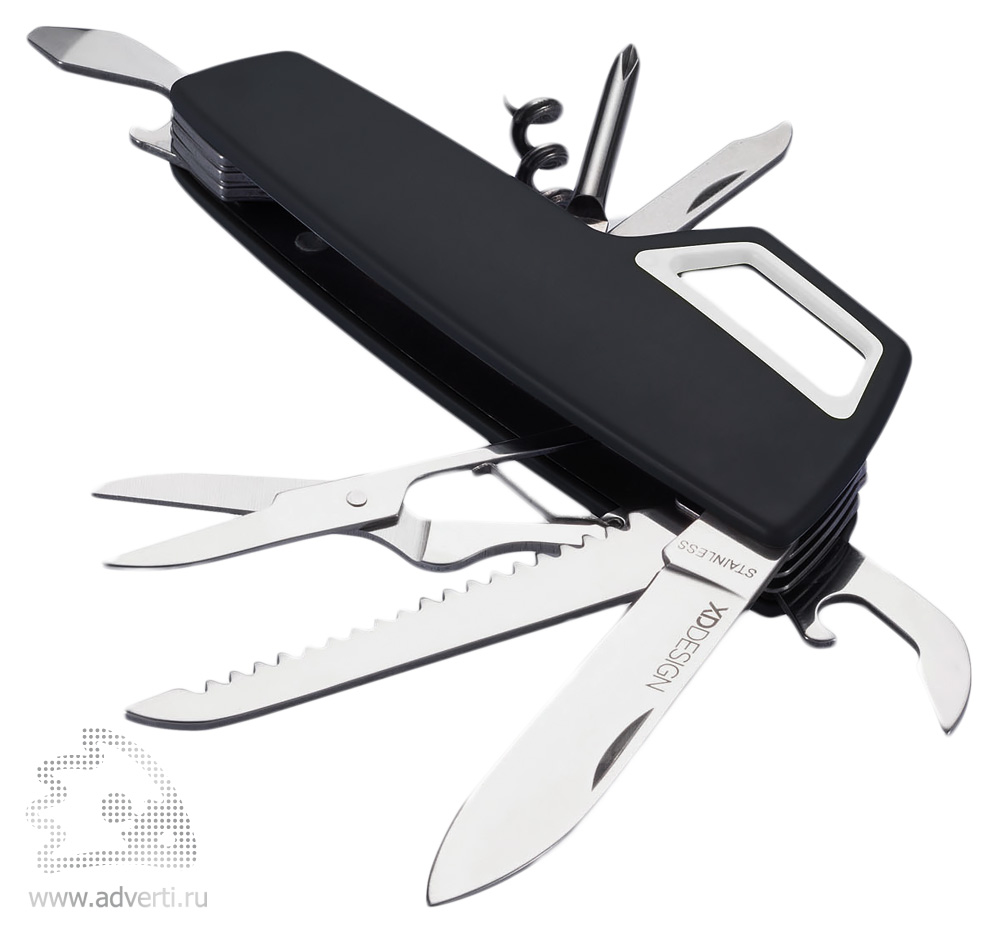 Нож, штопор, крестовая отвертка, прямая отвертка, открывалка для бутылок, консервный нож, пила, пилка, ножницы и карабин